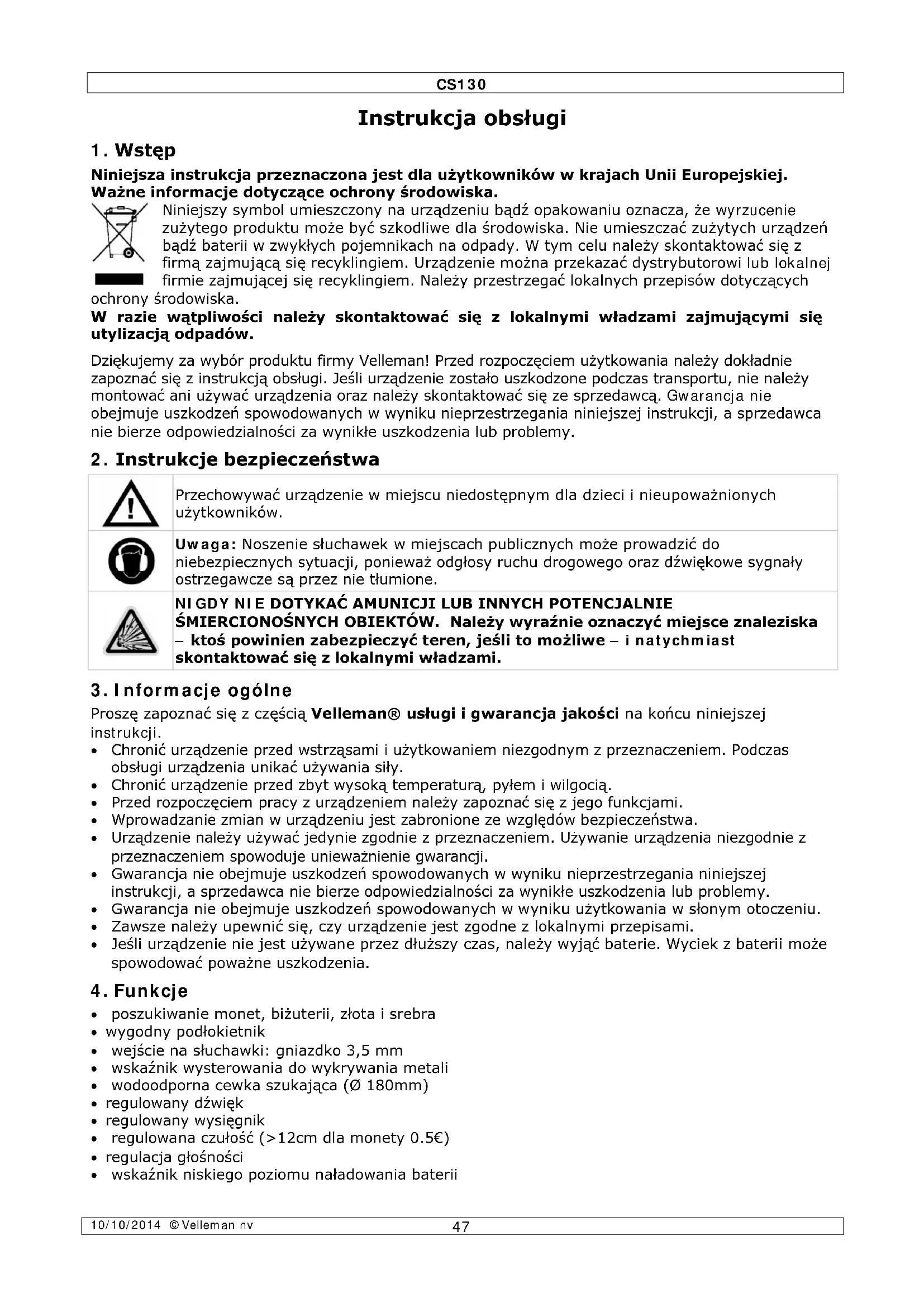 - Taktykę należy wybrać w zależności od rodzaju terenu – bardziej opłacalne jest gruntowne przeszukanie niewielkiego obszaru, niż prowadzenie poszukiwań na dużym obszarze na zasadzieCS130 10/10/2014 © Velleman nv