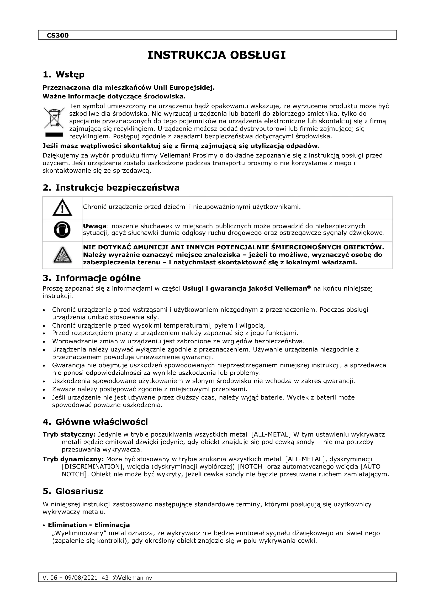 wejście słuchawkowe 3.5 mm jack zasilanie ........................................................................... 2 x 9 V bateria (6LR61C, nie załącz.) częstotliwość .............................................................................................................. 6.6 kHz detekcja w trybie statycznym ................................................................... tak (wszystkie metale) detekcja w trybie dynamicznym ................................................dyskryminacja, notch, auto notch regulowana czułość ............................................................................................. 12 poziomόw czułość ........................................................... 25 cm (dyskryminacja), 27 cm (wszystkie metale) identyfikacja tonu ............................................................................................. 3 rόżne dźwięki indykacja intensywności sygnału ......................................................... tak (w trybie statycznym) indykacja głębokości .......................................................................................... 12 segmentόw ekran LCD ........................................................................................................... 75 x 40 mm namierzanie obiektu .......................................................................................................... nie ręczna eliminacja wpływu gruntu ......................................................................................... tak powierzchniowy tryb eliminacji ............................................................................................ tak zapis ustawień .................................................................................................................. tak regulacja głośności ............................................................................................................ tak wskaźnik niskiego poziomu naładowania baterii..................................................................... tak głowica ..................................................................................................................... Ø 22 cm Używaj tylko oryginalnych akcesoriów. Velleman NV nie może być pociągnięty do odpowiedzialności w przypadku uszkodzenia lub szkody wynikały z (błędne) korzystanie z tego urządzenia. Aby uzyskać więcej informacji dotyczących tego produktu i najnowsza wersja tej instrukcji, odwiedź naszą stronę internetową www.velleman.eu.Informacje zawarte w niniejszej instrukcji obsługi mogą ulec zmianie bez wcześniejszego powiadomienia. RED Deklaracja zgodności Velleman NV niniejszym oświadcza, że typ urządzenia radiowego [CS300] jest zgodny z dyrektywą 2014/53/EU. Pełny tekst deklaracji zgodności UE jest dostępny pod następującym adresem internetowym: www.velleman.eu.