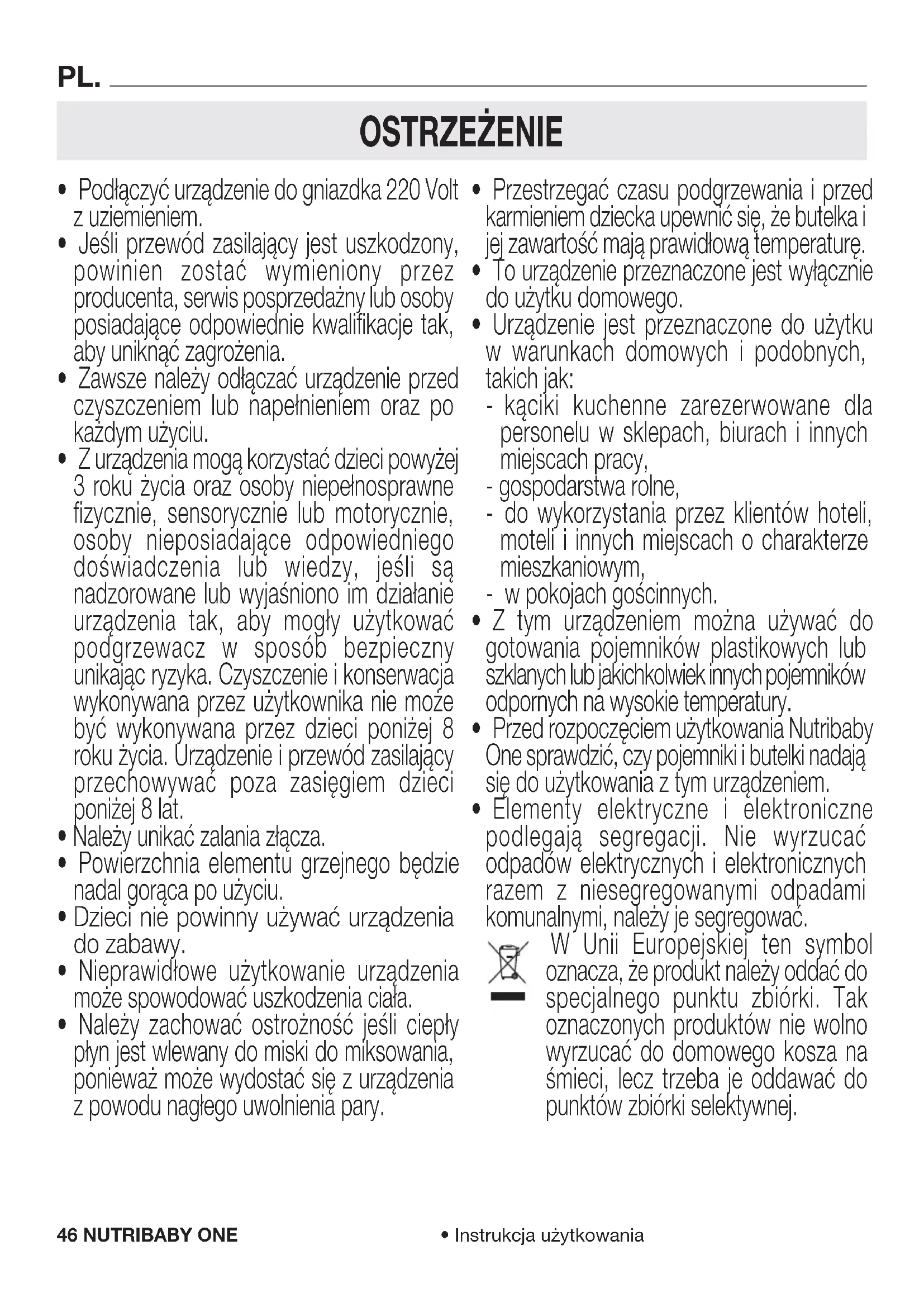 - Elementy elektryczne i elektroniczne podlegają segregacji. Nie wyrzucać odpadów elektrycznych i elektronicznych razem z niesegregowanymi odpadami komunalnymi, należy je segregować. W Unii Europejskiej ten symbol oznacza, że produkt należy oddać do specjalnego punktu zbiórki. Tak oznaczonych produktów nie wolno wyrzucać do domowego kosza na śmieci, lecz trzeba je oddawać do punktów zbiórki selektywnej.47NUTRIBABY ONE