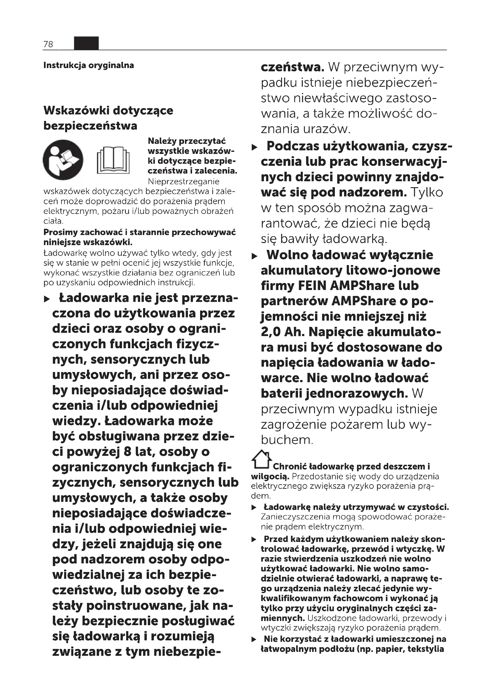 – 4,0Ah min 16/25 – 5,0Ah min 20/35 pl 79 34101366060 • 1.6.22Ładowarka GAL 18V-160 Liczba ogniw akumulatora 5–15 Waga zgodnie z EPTA-Procedure 01:2014 kg 0,95 Klasa ochrony / II A) w zależności od temperatury i typu akumulatora B) Stan naładowania akumulatora wynosi 50% (po ładowaniu w trybie Power Boost). Akumulator można wyjąć w celu natychmiastowego użycia. C) Stan naładowania akumulatora wynosi ok. 80% (po ładowaniu w trybie Power Boost). Akumulator można wyjąć w celu natychmiastowego użycia. D) Stan naładowania akumulatora wynosi ok. 80% (po ładowaniu w trybie standardowym). Akumulator można wyjąć w celu natychmiastowego użycia. E) Stan naładowania akumulatora wynosi 97– 100% (po ładowaniu w trybie standardowym). PracaPolski MontażPolski u Przed przystąpieniem do jakichkolwiek prac przy ładowarce należy wyjąć wtyczkę z gniaz- da. Montaż ściennyPolski Ładowarka może być używana w pozycji stojącej (na stole) lub wiszącej (na ściane). Montaż ścienny: Otwory do zamocowania łado- warki należy wywiercić, zachowując odstęp jak na rysunku. Do przykręcenia ładowarki należy użyć wkrętów z łbem okrągłym o średnicy 5 do maks. 6,5 mm. UruchamianiePolski u Należy zwrócić uwagę na napięcie siecio- we! Napięcie źródła zasilania musi zgadzać się z danymi na tabliczce znamionowej ładowarki. Ładowarki przeznaczone do pracy pod napię- ciem 230V można podłączyć również do sieci 220V. Proces ładowaniaPolski Ładowanie rozpoczyna się w momencie włoże- nia wtyczki ładowarki do gniazda sieciowego i umieszczenia akumulatora we wnęce ładowania (1). Inteligentny proces ładowania pozwala na auto- matyczne rozpoznawanie stanu naładowania akumulatora i optymalny dobór prądu ładowa- nia, w zależności od napięcia i temperatury aku- mulatora. Ma to wpływ na wydłużenie żywotności akumu- latora, a poza tym akumulator, przechowywany w ładowarce, będzie stale naładowany do pełna. Znaczenie wskaźnikówPolski Zielony wskaźnik stanu naładowania akumulatora (3)Polski 5 zielonych diod LED wskazuje stan naładowania akumulatora podczas i po zakończeniu ładowania. Jedna dioda LED świecąca się światłem cią- głym wskazuje pojemność akumulatora wyno- szącą ok. 20%. Status diody LED Pojemność akumulatora ok. 5 diod LED świeci się jedna po drugiej. <20% Najniższa dioda LED świeci się światłem ciągłym. 20% 2 dolne diody LED świecą się światłem ciągłym. 40% 3 dolne diody LED świecą się światłem ciągłym. 60% 4 dolne diody LED świecą się światłem ciągłym. 80% 5 diod LED świeci się świa- tłem ciągłym. >95% Wskazówka: Ładowanie jest możliwe tylko wte- dy, gdy temperatura akumulatora znajduje się w dopuszczalnym zakresie temperatur, zob. roz- dział „Dane techniczne”. 80 pl 34101366060 • 1.6.22Czerwony wskaźnik temperatury/błędu (5)Polski Światło ciągłePolski Czerwone światło ciągłe sygnalizuje, że temperatura akumulatora znajduje się poza dopuszczalnym zakresem temperatur ładowania, zob. rozdział „Dane techniczne”. Proces ładowania rozpocznie się po osiągnięciu dopuszczalnego zakresu tem- peratur. Światło migającePolski Czerwone światło migające oznacza, że akumulator lub ładowarka są uszkodzone. Przycisk trybu Power Boost(4)Polski Naciśnięcie przycisku Power Boost(4) powoduje aktywację trybu szybkiego ładowania. Można to zrobić przed włożeniem akumulatora lub wtedy, gdy akumulator znajduje się w ładowarce. Pod- czas szybkiego ładowania przycisk Power Boost(4) świeci się na czerwono. Ponowne na- ciśnięcie przycisku Power Boost powoduje po- wrót do standardowego trybu ładowania. Po zakończeniu szybkiego ładownia (do ok. 50% pojemności akumulatora) gaśnie przycisk Power Boost(4). Jeśli akumulator pozostanie w łado- warce, będzie nadal ładowany. Sygnał dźwiękowyPolski Po zakończeniu cyklu ładowania emitowany jest krótki sygnał dźwiękowy. Błędy – przyczyny i usuwaniePolski Przyczyna Rozwiązanie Czerwony wskaźnik temperatury/błędu(5) miga Nie można naładować akumulatora Akumulator nie został (prawidłowo) włożony Umieścić akumulator prawidłowo w łado- warce Styki akumulatora są zabrudzone Oczyścić styki akumu- latora; np. poprzez kil- kakrotne włożenie i wyjęcie akumulatora, lub wymienić akumula- tor na nowy Akumulator jest uszko- dzony Wymienić akumulator na nowy Ładowarka jest uszko- dzona Ew. zlecić kontrolę ła- dowarki w autoryzo- wanym punkcie serwi- sowym elektronarzędzi firmyFEIN Zielony wskaźnik stanu naładowania akumulatora(3) nie świeci się Przyczyna Rozwiązanie Wtyczka sieciowa łado- warki nie została (pra- widłowo) podłączona do gniazda Włożyć wtyczkę siecio- wą (całkowicie) do gniazda Gniazdo, przewód sie- ciowy lub ładowarka są uszkodzone Skontrolować napięcie sieciowe, a w razie stwierdzenia takiej ko- nieczności oddać łado- warkę do przeglądu w autoryzowanym punk- cie serwisowym elek- tronarzędzi firmyFEIN Wskazówki dotyczące pracyPolski Zdecydowanie krótszy czas pracy po ładowaniu wskazuje na zużycie akumulatora i konieczność jego wymiany na nowy. Ładowanie ciągłe akumulatora, jak również kilka następujących bezpośrednio po sobie cykli łado- wania, może spowodować nagrzanie się łado- warki. Jest to zjawisko normalne i nie świadczy o żadnej wadzie technicznej ładowarki. Chłodzenie akumulatora (Active Air Cooling)Polski Wbudowany w ładowarce sterownik chłodzenia ma za zadanie nadzorowanie temperatury łado- wanego akumulatora. Gdy tylko temperatura akumulatora przekroczy ok. 0 °C, wentylator za- czyna go chłodzić. Włączony wentylator wydaje podczas chłodzenia charakterystyczny dźwięk. Jeżeli wentylator się nie włącza, oznacza to, że wentylator jest uszkodzony, lub że temperatura akumulatora wynosi <0°C. Może to przedłużyć czas ładowania. ŁadowaniePolski Tryb ładowania Power BoostPolski 