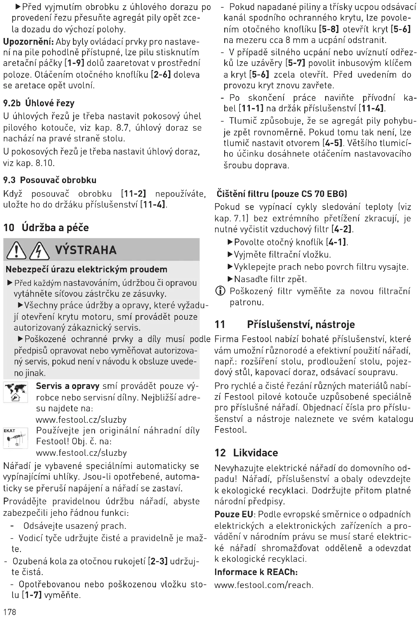 Stosować wyłącznie oryginalne części zamienne Festool! Nr zam. na stronie: www.festool.pl/serwis Urządzenie wyposażone jest w samowyłączające specjalne szczotki węglowe. Jeśli są one zużyte, następuje automatyczne przerwanie zasilania i urządzenie zatrzymuje się.192 Dla zapewnienia prawidłowego funkcjonowania urządzenie należy regularnie poddawać konser- wacji: - Usuwać nagromadzony pył poprzez odsysanie. - Utrzymywać drążki prowadzące w czystości i regularnie smarować. - Utrzymywać w czystości koła zębate za uchwy- tem obrotowym [2-3]. - Zużytą lub uszkodzoną wkładkę stołową [1-7] należy wymienić. - Zatkanie kanału odsysającego dolnej osłony przez opadające drzazgi można usunąć odkrę- cając pokrętło [5-8] i otwierając klapę [5-6] na ok. 8 mm. - Przy dużych zatkaniach lub zakleszcze- niach pozostałości po cięciu można odkrę- cić zamknięcia [5-7] za pomocą klucza sze- ściokątnego, tak aby klapę [5-6] można było otworzyć całkowicie. Przed uruchomie- niem klapę należy ponownie zamknąć. - Po zakończeniu pracy należy nawinąć przewód zasilający [11-1] na uchwyty [11-4]. - Tłumik powoduje, że agregat pilarski na całej długości przesuwu równomiernie przesuwa się do tyłu. W przeciwnym wypadku tłumik można wyregulować poprzez otwór [4-5]. Wzmocnie- nie działania tłumiącego można osiągnąć po- przez obracanie w prawo śruby nastawczej. Czyszczenie filtra (tylko CS 70 EBG) Jeśli cykle wyłączania kontroli temperatury (patrz rozdz. 7.1) staną się krótsze bez nadmier- nego obciążenia, należy oczyścić filtr ssania po- wietrza [4-2]. fOdkręcić pokrętło [4-1]. fWyjąć wkład filtra. fWytrząsnąć pył lub odkurzyć powierzchnię filtra. fPonownie włożyć filtr. L Uszkodzony filtr należy zastąpić nowym wkładem filtracyjnym. 11 Wyposażenie, narzędzia Firma Festool oferuje kompleksowe wyposa- żenie, ułatwiające różnorodne i efektywne wy- korzystania posiadanego elektronarzędzia, np.: element rozszerzający stół, element przedłuża- jący stół, stół przesuwny, prowadnica do obcina- nia długich elementów, zestaw do odsysania. W celu umożliwienia szybkiej i czystej obróbki różnych materiałów, Festool oferuje tarcze pi- larskie dostosowane specjalnie do danego urzą- dzenia. Numery zamówień elementów wyposa- żenia i narzędzi znajdziesz u swojego partnera handlowego. 12 Utylizacja Nie wolno wyrzucać narzędzi elektrycznych wraz z odpadami domowymi! Urządzenia, wyposa- żenie i opakowania należy przekazać zgodnie z przepisami o ochronie środowiska do odzysku surowców wtórnych. Należy przy tym przestrze- gać obowiązujących przepisów państwowych. Tylko UE: Zgodnie z europejską dyrektywą doty- czącą zużytych urządzeń elektrycznych i elektro- nicznych i jej transpozycją do prawa krajowego, zużyte elektronarzędzia podlegają segregacji i recyklingowi w sposób przyjazny środowisku. Informacje dotyczące rozporządzenia REACh: www.festool.com/reach1