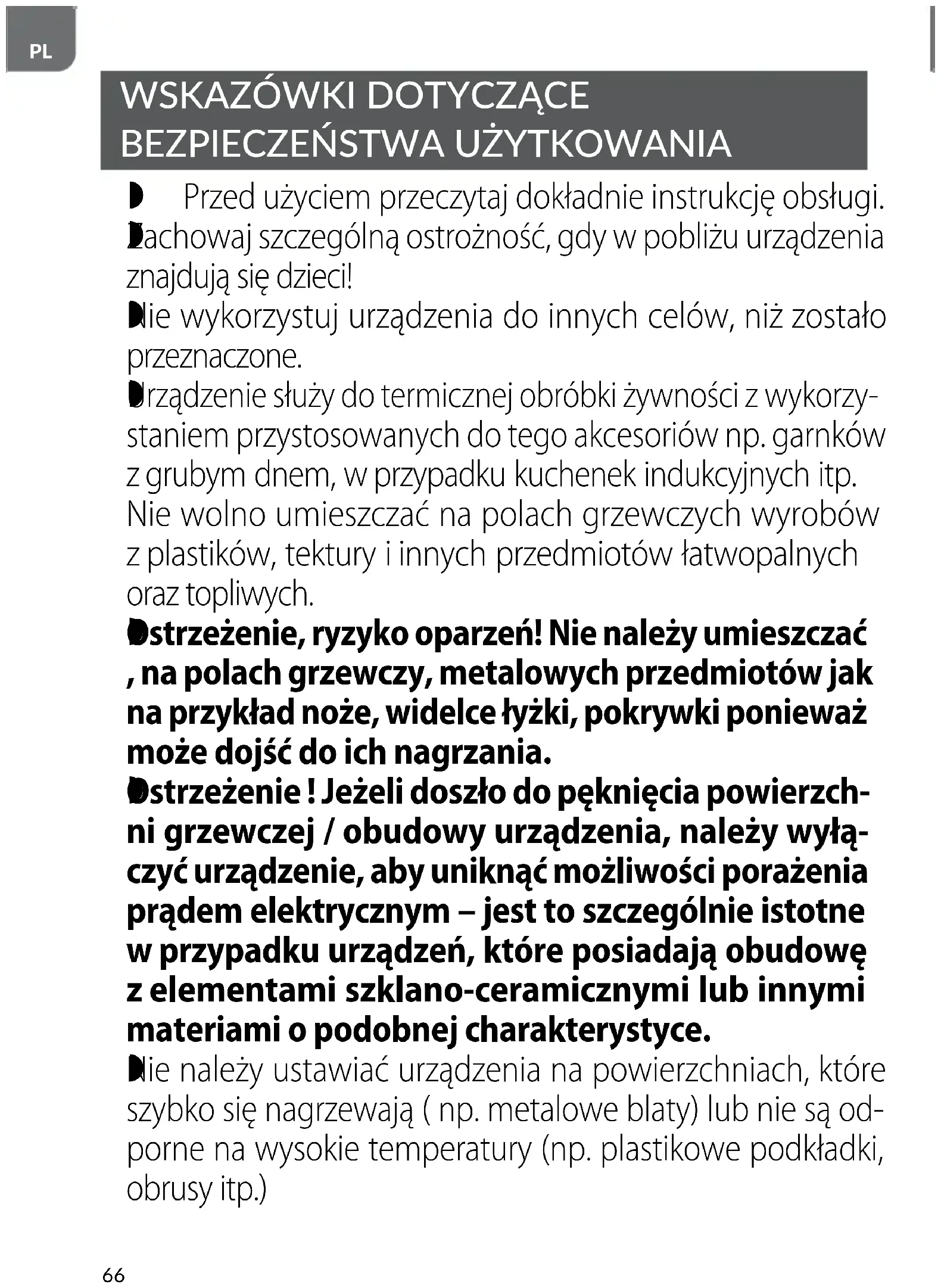 Ostrzeżenie ! Jeżeli doszło do pęknięcia powierzch- ni grzewczej / obudowy urządzenia, należy wyłą- czyć urządzenie, aby uniknąć możliwości porażenia prądem elektrycznym – jest to szczególnie istotne wprzypadku urządzeń, które posiadają obudowę zelementami szklano-ceramicznymi lub innymi materiami opodobnej charakterystyce.