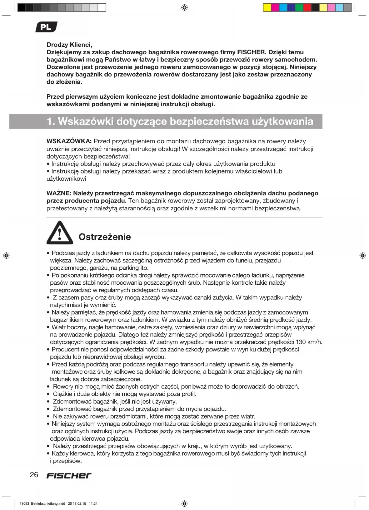 Drodzy Klienci, Dziękujemy za zakup dachowego bagażnika rowerowego firmy FISCHER. Dzięki temu bagażnikowi mogą Państwo w łatwy i bezpieczny sposób przewozić rowery samochodem. Dozwolone jest przewożenie jednego roweru zamocowanego w pozycji stojącej. Niniejszy dachowy bagażnik do przewożenia rowerów dostarczany jest jako zestaw przeznaczony do złożenia. Przed pierwszym użyciem konieczne jest dokładne zmontowanie bagażnika zgodnie ze wskazówkami podanymi w niniejszej instrukcji obsługi. Ostrzeżenie 18093_Betriebsanleitung.indd 26 13.02.15 11:2427