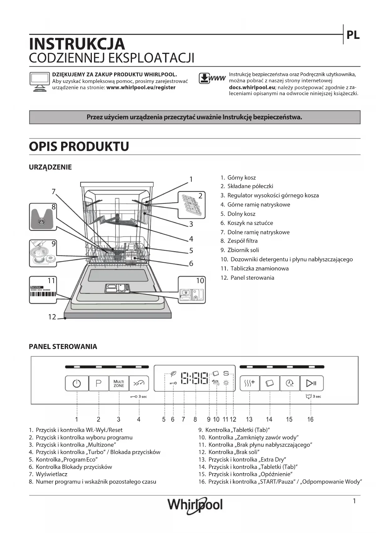INSTRUKCJA CODZIENNEJ EKSPLOATACJI Przez użyciem urządzenia przeczytać uważnie Instrukcję bezpieczeństwa. URZĄDZENIE OPIS PRODUKTU PANEL STEROWANIA DZIĘKUJEMY ZA ZAKUP PRODUKTU WHIRLPOOL. Aby uzyskać kompleksową pomoc, prosimy zarejestrować urządzenie na stronie: www.whirlpool.eu/registerInstrukcję bezpieczeństwa oraz Podręcznik użytkownika, można pobrać z naszej strony internetowej docs.whirlpool.eu; należy postępować zgodnie z za-leceniami opisanymi na odwrocie niniejszej książeczki.1. Górny kosz2. Składane półeczki3. Regulator wysokości górnego kosza4. Górne ramię natryskowe5. Dolny kosz6. Koszyk na sztućce7. Dolne ramię natryskowe8. Zespół ltra9. Zbiornik soli10. Dozowniki detergentu i płynu nabłyszczającego11. Tabliczka znamionowa12. Panel sterowania1. Przycisk i kontrolka Wł.-Wył./Reset2. Przycisk i kontrolka wyboru programu3. Przycisk i kontrolka „Multizone” 4. Przycisk i kontrolka „Turbo” / Blokada przycisków5. Kontrolka „Program Eco”6. Kontrolka Blokady przycisków7. Wyświetlacz8. Numer programu i wskaźnik pozostałego czasu9. Kontrolka „Tabletki (Tab)”10. Kontrolka „Zamknięty zawór wody”11. Kontrolka „Brak płynu nabłyszczającego”12. Kontrolka „Brak soli”13. Przycisk i kontrolka „Extra Dry”14. Przycisk i kontrolka „Tabletki (Tab)”15. Przycisk i kontrolka „Opóźnienie”16. Przycisk i kontrolka „START/Pauza” / „Odpompowanie Wody”0000 000 00000 Service: