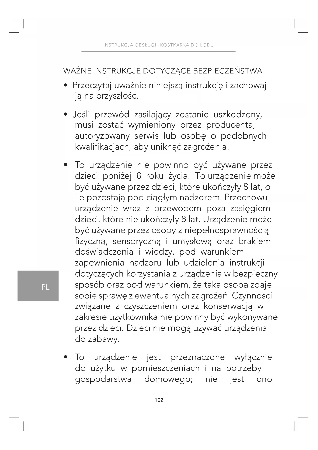 - To urządzenie nie powinno być używane przez dzieci poniżej 8 roku życia. To urządzenie może być używane przez dzieci, które ukończyły 8 lat, o ile pozostają pod ciągłym nadzorem. Przechowuj urządzenie wraz z przewodem poza zasięgiem dzieci, które nie ukończyły 8 lat. Urządzenie może być używane przez osoby z niepełnosprawnością zyczną, sensoryczną i umysłową oraz brakiem doświadczenia i wiedzy, pod warunkiem zapewnienia nadzoru lub udzielenia instrukcji dotyczących korzystania z urządzenia w bezpieczny sposób oraz pod warunkiem, że taka osoba zdaje sobie sprawę z ewentualnych zagrożeń. Czynności związane z czyszczeniem oraz konserwacją w zakresie użytkownika nie powinny być wykonywane przez dzieci. Dzieci nie mogą używać urządzenia do zabawy.