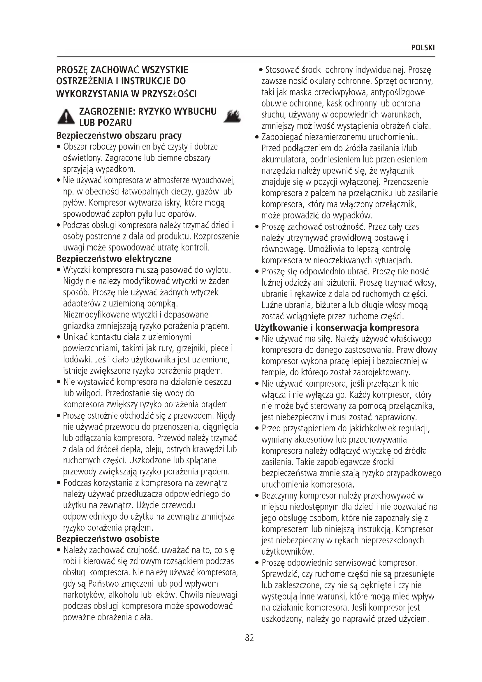 NIEBEZPIECZNEGO DZIAŁANIA. OSTRZEŻENIE: Podczas obsługi elektronarzędzi należy zachować czujność, uważać na to, co się robi i kierować się zdrowym rozsądkiem. Nie należy używać kompresora, gdy są Państwo zmęczeni lub pod wpływem narkotyków, alkoholu lub leków. Chwila nieuwagi podczas obsługi kompresora może spowodować poważne obrażenia ciała.
