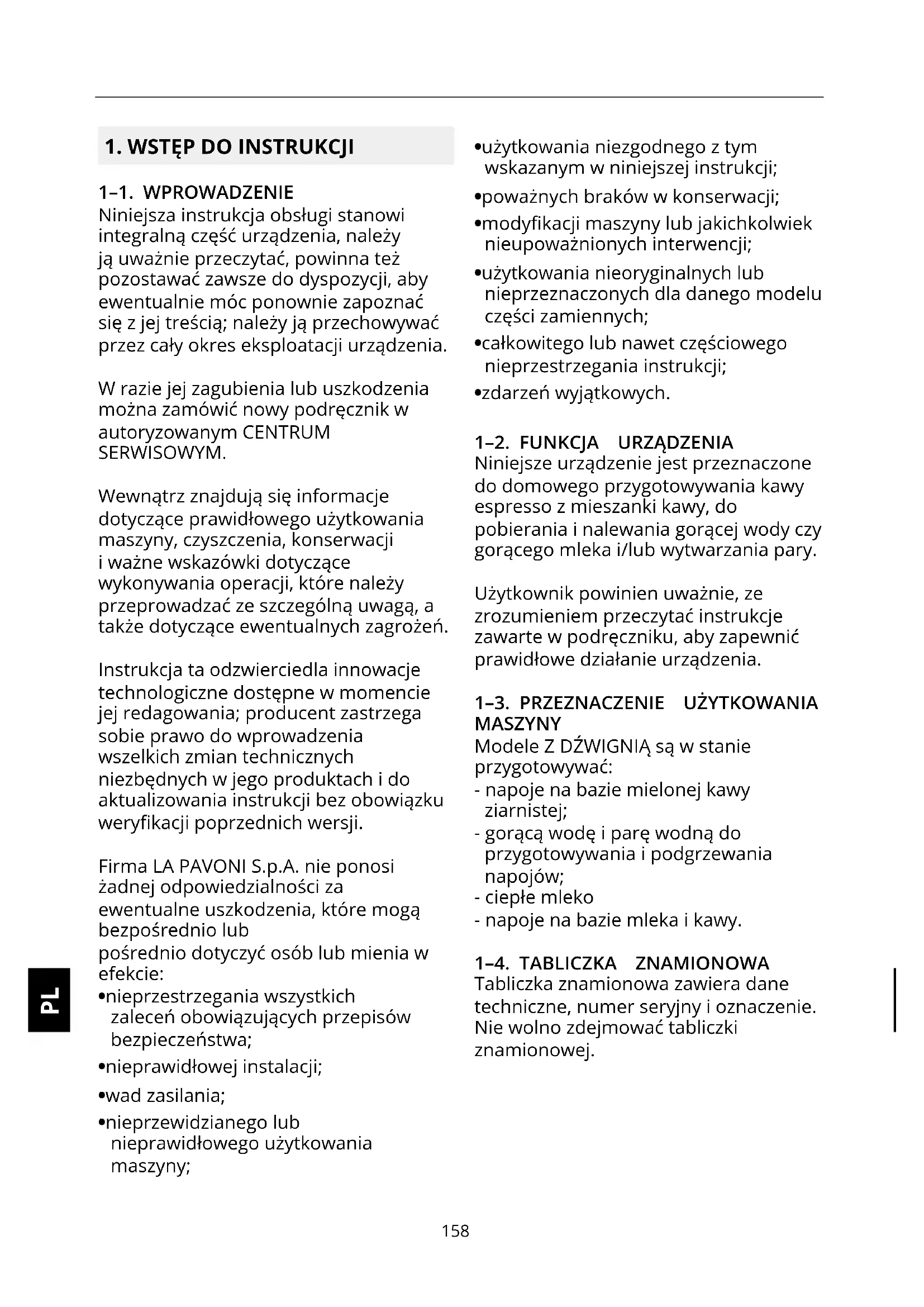 1–1. WPROWADZENIE Niniejsza instrukcja obsługi stanowi integralną część urządzenia, należy ją uważnie przeczytać, powinna też pozostawać zawsze do dyspozycji, aby ewentualnie móc ponownie zapoznać się z jej treścią; należy ją przechowywać przez cały okres eksploatacji urządzenia. W razie jej zagubienia lub uszkodzenia można zamówić nowy podręcznik w autoryzowanym CENTRUM SERWISOWYM. Wewnątrz znajdują się informacje dotyczące prawidłowego użytkowania maszyny, czyszczenia, konserwacji i ważne wskazówki dotyczące wykonywania operacji, które należy przeprowadzać ze szczególną uwagą, a także dotyczące ewentualnych zagrożeń. Instrukcja ta odzwierciedla innowacje technologiczne dostępne w momencie jej redagowania; producent zastrzega sobie prawo do wprowadzenia wszelkich zmian technicznych niezbędnych w jego produktach i do aktualizowania instrukcji bez obowiązku werykacji poprzednich wersji. Firma LA PAVONI S.p.A. nie ponosi żadnej odpowiedzialności za ewentualne uszkodzenia, które mogą bezpośrednio lub pośrednio dotyczyć osób lub mienia w efekcie: