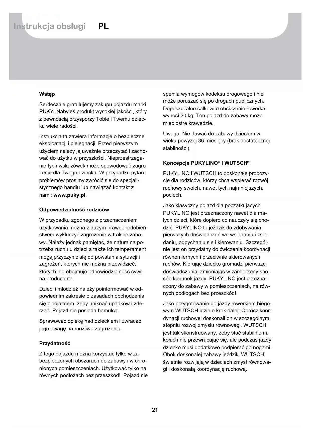 PUKYLINO i WUTSCH to doskonałe propozy- cje dla rodziców, którzy chcą wspierać rozwój ruchowy swoich, nawet tych najmniejszych, pociech. Jako klasyczny pojazd dla początkujących PUKYLINO jest przeznaczony nawet dla ma- łych dzieci, które dopiero co nauczyły się cho- dzić. PUKYLINO to jeździk do zdobywania pierwszych doświadczeń we wsiadaniu i zsia- daniu, odpychaniu się i kierowaniu. Szczegól- nie jest on przydatny do ćwiczenia koordynacji równomiernych i przeciwnie skierowanych ruchów. Kierując dziecko gromadzi pierwsze doświadczenia, zmieniając w zamierzony spo- sób kierunek jazdy. PUKYLINO jest przezna- czony do zabawy w pomieszczeniach, na rów- nych podłogach bez przeszkód! Jako przygotowanie do jazdy rowerkiem biego- wym WUTSCH idzie o krok dalej: Oprócz koor- dynacji ruchowej doskonali on w szczególnym stopniu rozwój zmysłu równowagi. WUTSCH jest tak skonstruowany, żeby stać stabilnie na kołach nie przewracając się, ale podczas jazdy dziecko musi dodatkowo podpierać go nogami. Obok doskonałej zabawy jeździki WUTSCH świetnie rozwijają w dzieciach zmysł równowa- gi i doskonalą koordynację ruchową.22 PUKYLINO & WUTSCH Wskazówki dotyczące użytkowania Konieczne jest noszenie zamkniętego obuwia. Pojazd nie może być używany w pobliżu scho- dów, skarp, basenów i innych zbiorników wod- nych. Znajdujące się w pobliżu schody należy zabezpieczyć tak, żeby dzieci nie mogły po nich wjeżdżać ani z nich zjeżdżać pojazdem. Obowiązuje ustawowa odpowiedzialność cy- wilna za wady fizyczne rzeczy. Szkody spowo- dowane przez niewłaściwe użytkowanie, uży- cie siły, niedostateczną konserwację lub będą- ce konsekwencją normalnego zużycia nie są objęte tą odpowiedzialnością. Znak CE Pojazd spełnia wymagania europejskiej dyrek- tywy 2009/48/WE o bezpieczeństwie zabawek i na tej podstawie posiada znak CE. Tabliczka znamionowa Tabliczka znamionowa jest umieszczona na tylnej ramie. Podane na niej informacje zanotuj w paszporcie umieszczonym na końcu tej in- strukcji obsługi, aby mieć je pod ręką w razie kontaktu z serwisem lub zamawiania części zamiennych. Konserwacja i pielęgnacja Przed użyciem sprawdzać możliwe zużycie wszystkich części oraz poprawne zamocowa- nie połączeń skręcanych. Samozabezpieczają- ce się nakrętki obracają się bardzo ciężko i po całkowitym odkręceniu muszą zostać wymie- nione na nowe! Żeby zapewnić wysoki, uzyskany konstrukcyj- nie poziom bezpieczeństwa pojazdu, części zużyte lub uszkodzone należy niezwłocznie wymienić na oryginalne części zamienne PUKY. Do momentu naprawy uszkodzonego pojazdu nie należy używać. Części wygiętych nie prostować, lecz wymienić. Części zużywające się: koła, zderzak osi (tylko WUTSCH) Pojazdu nie czyścić wysokociśnieniową myjką. Pojazd wyczyścić słabym roztworem mydła, następnie wszystkie umyte części dokładnie wytrzeć do sucha miękką szmatą. Pojazdu nie wystawiać na działanie materiałów sprzyjają- cych korozji (soli do posypywania dróg, mor- skiej wody i nawozów). Pojazdu nie przecho- wywać w wilgotnych pomieszczeniach. Rozpakowanie i zakres dostawy Do otwierania opakowania i do usuwania ma- teriału opakowaniowego nie używać ostrych przedmiotów. Przez nieuwagę można uszko- dzić lakier lub części pojazdu. ❚ Wszystkie części wyjąć z opakowania. ❚ Usunąć materiał ochronny. Wszelkie mate- riały opakowaniowe i przechowywać poza zasięgiem dzieci – ryzyko uduszenia. ❚ Sprawdzić kompletność dostawy i brak uszkodzeń. Jeżeli czegoś brakuje, to przed wznowieniem pracy należy zwrócić się do punktu handlowego, w którym dokonano zakupu.23 PUKYLINO & WUTSCH Instrukcja obsługi PL Zakres dostawy PUKYLINO