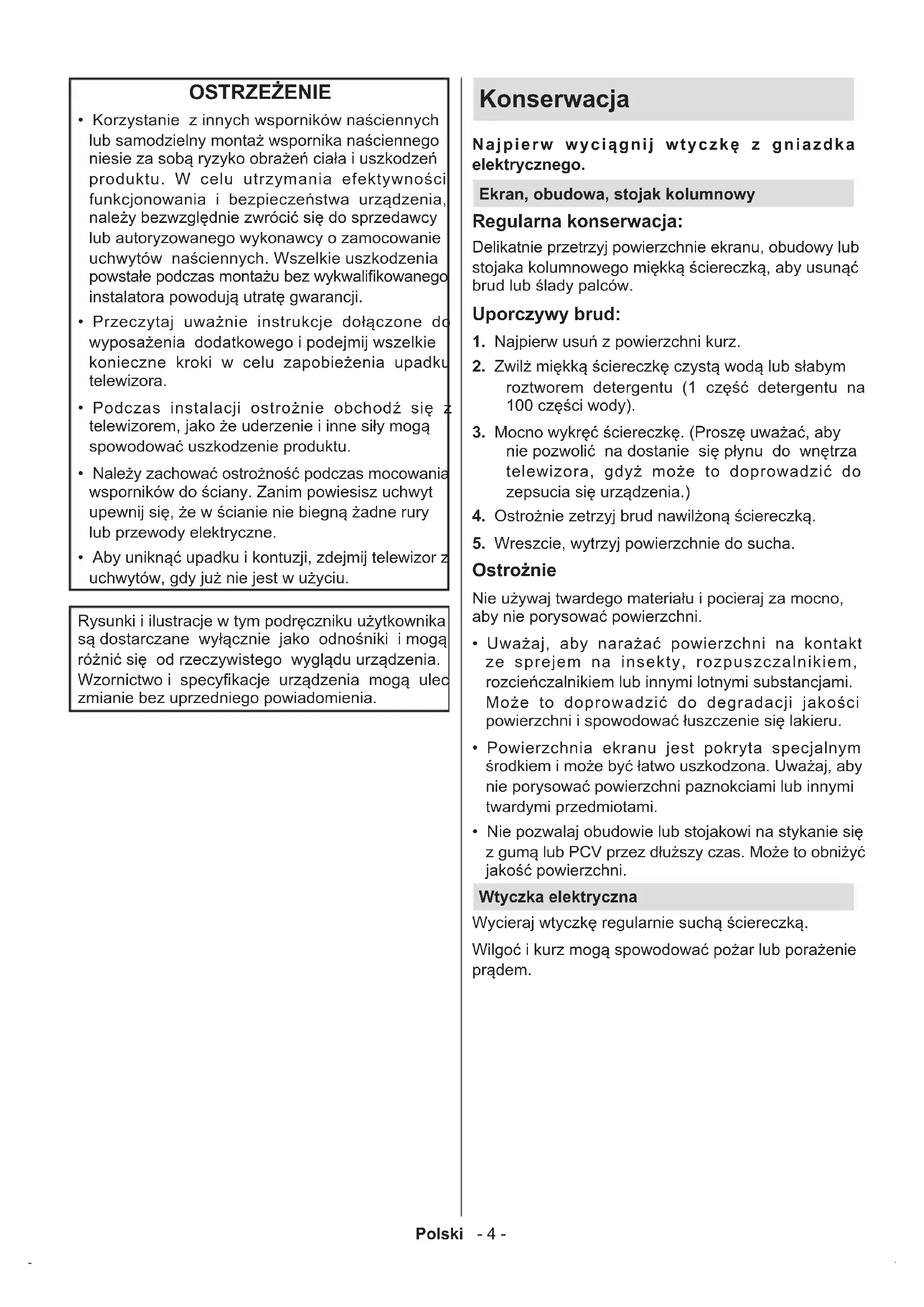 - Aby uniknąć upadku i kontuzji, zdejmij telewizor z uchwytów, gdy już nie jest w użyciu. Rysunki i ilustracje w tym podręczniku użytkownika są dostarczane wyłącznie jako odnośniki i mogą różnić się od rzeczywistego wyglądu urządzenia. Wzornictwo i specykacje urządzenia mogą ulec zmianie bez uprzedniego powiadomienia.