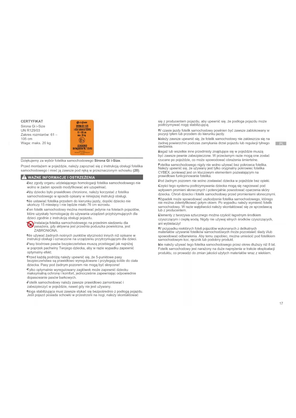 UN Regulation No. 129/03 Cybex GmbH Riedingerstr. 18, 95448 Bayreuth Germany Dziękujemy za wybór fotelika samochodowego Sirona Gi i-Size. Przed montażem w pojeździe, należy zapoznać się z instrukcją obsługi fotelika samochodowego i mieć ją zawsze pod ręką w przeznaczonym schowku (20).