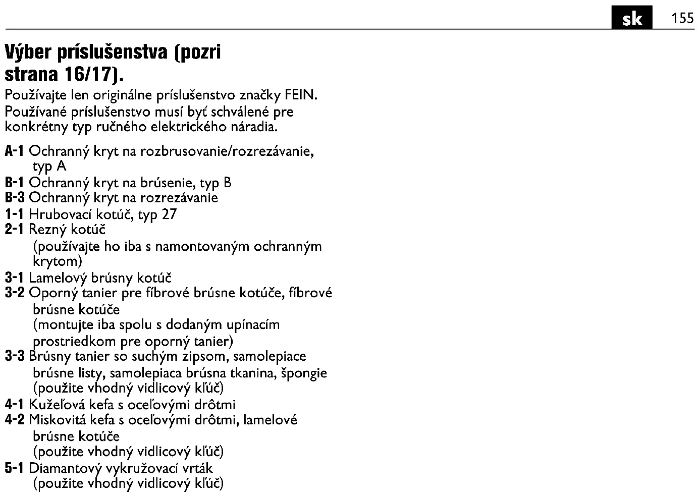 Podczas obróbki materiałów zawierających gips pył gipsowy może nagromadzić się w obudowie elektronarzędzia i na elemencie przełącznikowym i stwardnieć pod wpływem wilgotnego powietrza. Może to spowodować uszkodzenie mechanizmu sterującego. Należy często przedmuchiwać wnętrze elektronarzędzia (przez otwory wentylacyjne) oraz czyścić element przełącznikowy za pomocą suchego i bezolejowego powietrza sprężonego. Produktów, który miały kontakt z azbestem nie wolno oddawać do naprawy. Produkty skażone azbestem należy usuwać w sposób zgodny z obowiązującymi w danym kraju przepisami prawnymi dotyczącymi postępowania z azbestem. W razie konieczności naprawy elektronarzędzia wyprodukowanego przez firmę FEIN lub jego osprzętu należy zwrócić się do jednego z punktów obsługi klienta FEIN. Potrzebne adresy można znaleźć na stronie internetowej www.fein.com. Stare, nieczytelne lub uszkodzone naklejki i ostrzeżenia umieszczone na elektronarzędziu należy zastępować nowymi. Aktualna lista części zamiennych dla niniejszego elektronarzędzia znajduje się pod adresem internetowym www.fein.com. Należy stosować wyłącznie oryginalne części zamienne. W razie potrzeby możliwa jest wymiana we własnym zakresie następujących elementów: Narzędzia robocze, rękojeść dodatkowa, kołnierze mocujące, pokrywa ochronna, osłona ręki Rękojmia i gwarancja. Rękojmia na produkt jest ważna zgodnie z ustawowymi przepisami regulującymi w kraju, w którym produkt został wprowadzony do obrotu. Oprócz tego produkt objęty jest gwarancją firmy FEIN, zgodnie z deklaracją gwarancyjną producenta. W zakres dostawy nabytego elektronarzędzia może wchodzić tylko część ukazanego na rysunkach lub opisanego w instrukcji eksploatacji osprzętu. Oświadczenie o zgodności. Oświadczenie CE dotyczy tylko krajów Unii Europejskiej oraz Europejskiego Stowarzyszenia Wolnego Handlu (EFTA) i tylko wyrobów, które przeznaczone są do rozprowadzania na rynku UE lub EFTA. Po wprowadzeniu wyrobu na rynek EU, znak UKCA traci ważność. Oświadczenie UKCA (UK Conformity Assessed) dotyczy tylko Wielkiej Brytanii (Anglii, Walii i Szkocji) i tylko wyrobów, które przeznaczone są do rozprowadzania na rynku Wielkiej Brytanii. Po wprowadzeniu wyrobu na rynek brytyjski, znak CE traci ważność. Ochrona środowiska, usuwanie odpadów. Opakowanie, zużyte elektronarzędzia i osprzęt należy dostarczyć do utylizacji zgodnie z przepisami z ochrony środowiska. Wybór osprzętu (zob. str. 16/17). Należy stosować wyłącznie oryginalny osprzęt firmy FEIN. Osprzęt musi być przeznaczony dla danego typu elektronarzędzia. A-1 Pokrywa ochronna do cięcia, typ A B-1 Pokrywa ochronna do szlifowania, typ B B-3 Pokrywa ochronna do cięcia 1-1 Tarcza ścierna, typ 27 2-1 Tarcza do cięcia (stosować tylko z zamontowaną pokrywą ochronną) 3-1 Talerz szlifierski lamelkowy 3-2 Talerz oporowy do fibrowych tarcz szlifierskich, tarcze szlifierskie fibrowe (mocować tylko przy użyciu załączonego w dostawie narzędzia mocującego do talerzy oporowych) 3-3 Talerz szlifierski z mocowaniem na rzep, samoprzyczepne arkusze szlifierskie, okładzina włókninowa samoprzyczepna, gąbki (należy stosować pasujący klucz widełkowy) 4-1 Druciana szczotka stożkowa 4-2 Druciana szczotka garnkowa ze stali nierdzewnej, kółka szlifierskie lamelkowe (należy stosować pasujący klucz widełkowy) 5-1 Diamentowy frez do wycinania otworów (należy stosować pasujący klucz widełkowy)165