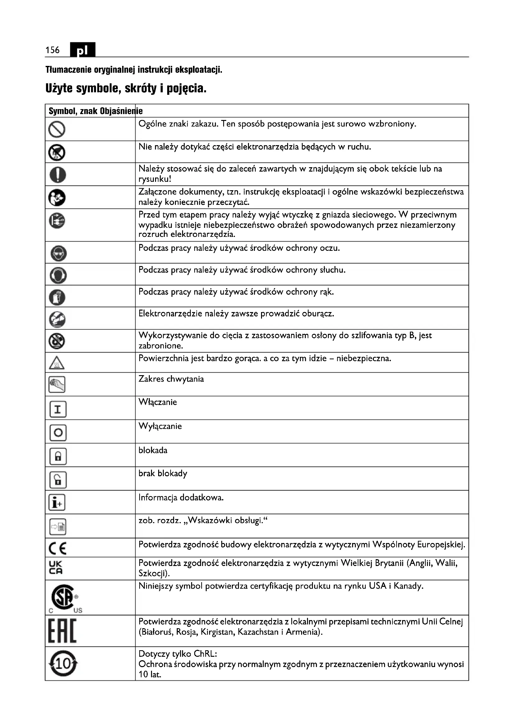 Tłumaczenie oryginalnej instrukcji eksploatacji. Użyte symbole, skróty i pojęcia. Symbol, znak Objaśnienie Ogólne znaki zakazu. Ten sposób postępowania jest surowo wzbroniony. Nie należy dotykać części elektronarzędzia będących w ruchu. Należy stosować się do zaleceń zawartych w znajdującym się obok tekście lub na rysunku! Załączone dokumenty, tzn. instrukcję eksploatacji i ogólne wskazówki bezpieczeństwa należy koniecznie przeczytać. Przed tym etapem pracy należy wyjąć wtyczkę z gniazda sieciowego. W przeciwnym wypadku istnieje niebezpieczeństwo obrażeń spowodowanych przez niezamierzony rozruch elektronarzędzia. Podczas pracy należy używać środków ochrony oczu. Podczas pracy należy używać środków ochrony słuchu. Podczas pracy należy używać środków ochrony rąk. Elektronarzędzie należy zawsze prowadzić oburącz. Wykorzystywanie do cięcia z zastosowaniem osłony do szlifowania typ B, jest zabronione. Powierzchnia jest bardzo gorąca. a co za tym idzie – niebezpieczna. Zakres chwytania Włączanie Wyłączanie blokada brak blokady Informacja dodatkowa. zob. rozdz. „Wskazówki obsługi.“ Potwierdza zgodność budowy elektronarzędzia z wytycznymi Wspólnoty Europejskiej. Potwierdza zgodność elektronarzędzia z wytycznymi Wielkiej Brytanii (Anglii, Walii, Szkocji). Niniejszy symbol potwierdza certyfikację produktu na rynku USA i Kanady. Potwierdza zgodność elektronarzędzia z lokalnymi przepisami technicznymi Unii Celnej (Białoruś, Rosja, Kirgistan, Kazachstan i Armenia). Dotyczy tylko ChRL: Ochrona środowiska przy normalnym zgodnym z przeznaczeniem użytkowaniu wynosi 10 lat.157