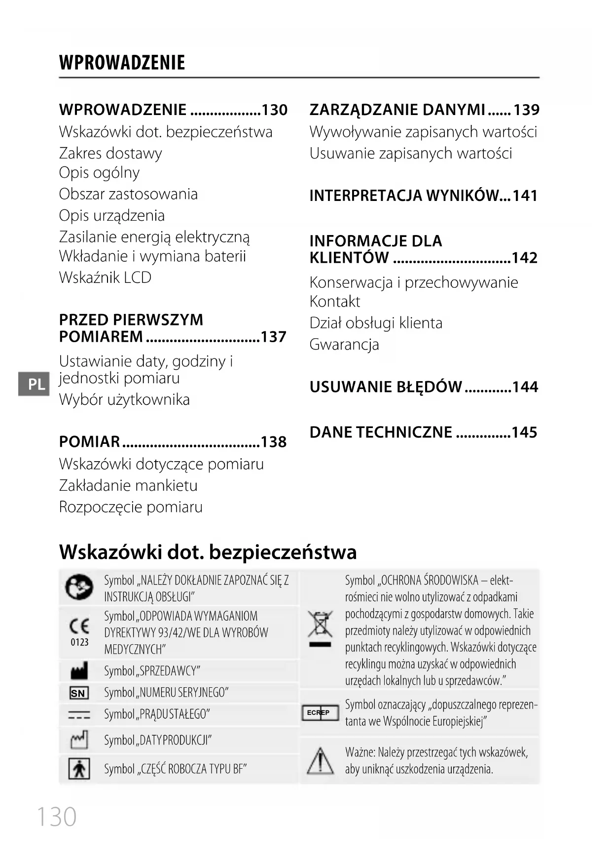 WPROWADZENIE ..................130 Wskazówki dot. bezpieczeństwa Zakres dostawy Opis ogólny Obszar zastosowania Opis urządzenia Zasilanie energią elektryczną Wkładanie i wymiana baterii Wskaźnik LCD PRZED PIERWSZYM POMIAREM .............................137 Ustawianie daty, godziny i jednostki pomiaru Wybór użytkownika POMIAR ...................................138 Wskazówki dotyczące pomiaru Zakładanie mankietu Rozpoczęcie pomiaru