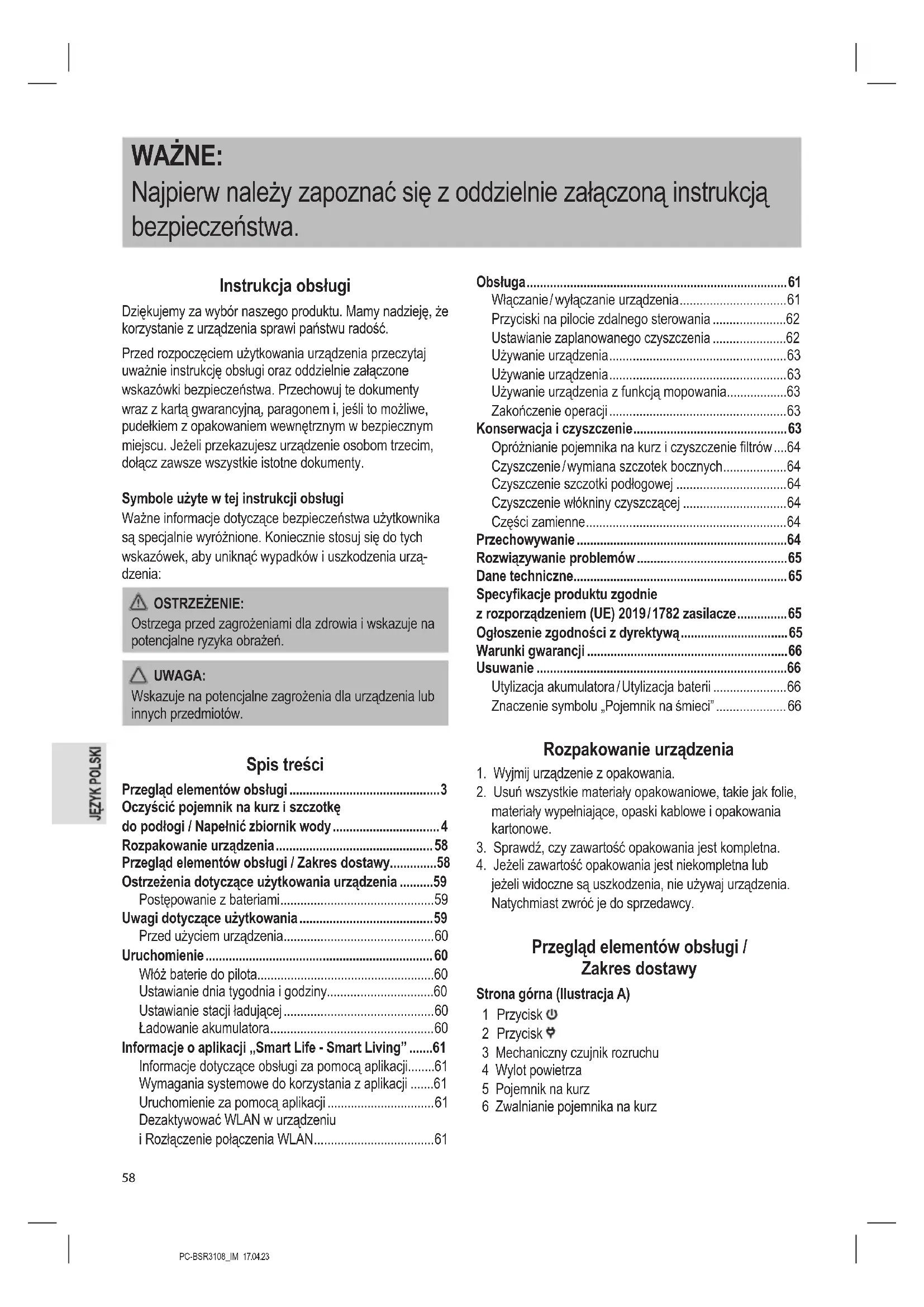 - Przegląd elementów obsługi / Zakres dostawy p. 58