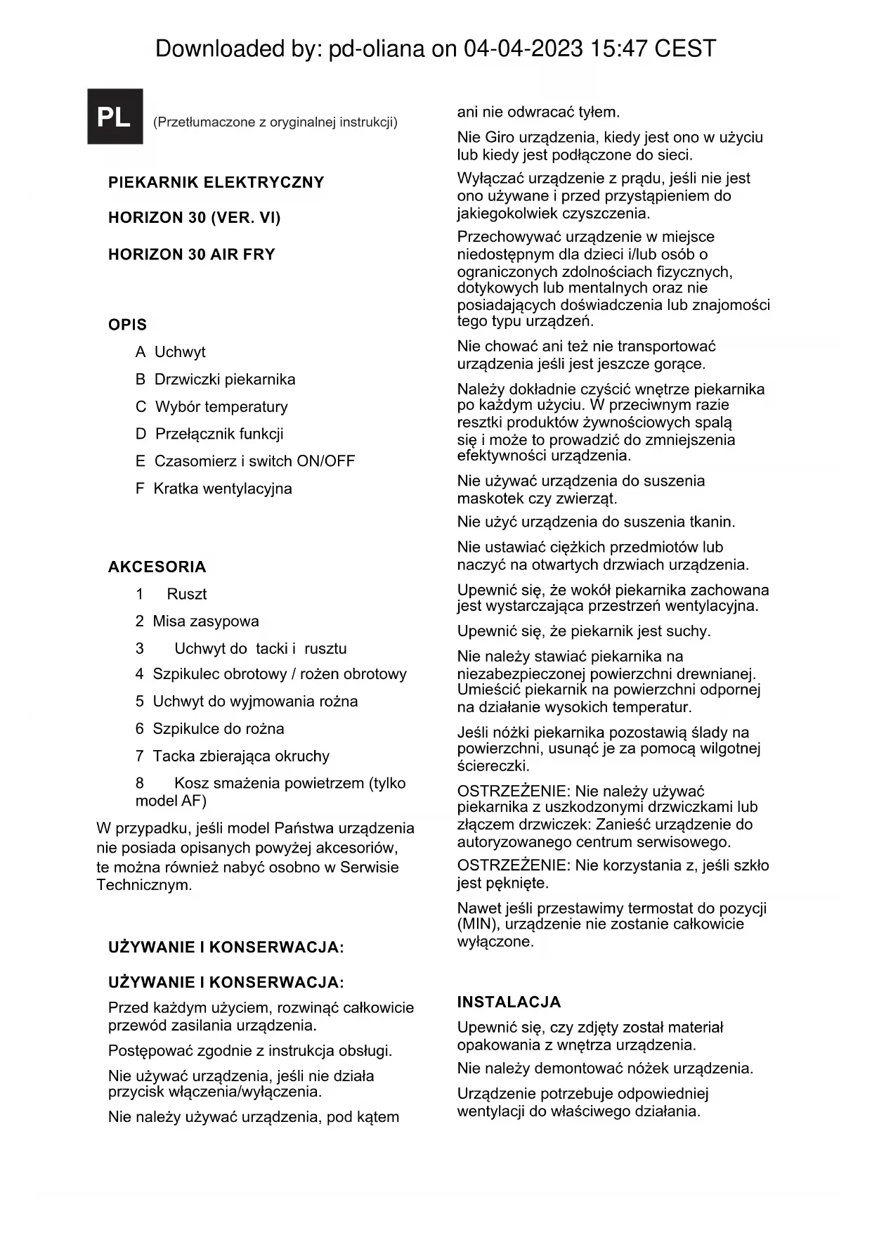OPIS A Uchwyt B Drzwiczki piekarnika C Wybór temperatury D Przełącznik funkcji E Czasomierz i switch ON/OFF F Kratka wentylacyjna AKCESORIA 1 Ruszt 2 Misa zasypowa 3 Uchwyt do tacki i rusztu 4 Szpikulec obrotowy / rożen obrotowy 5 Uchwyt do wyjmowania rożna 6 Szpikulce do rożna 7 Tacka zbierająca okruchy 8 Kosz smażenia powietrzem (tylko model AF) W przypadku, jeśli model Państwa urządzenia nie posiada opisanych powyżej akcesoriów, te można również nabyć osobno w Serwisie Technicznym. UŻYWANIE I KONSERWACJA: UŻYWANIE I KONSERWACJA: Przed każdym użyciem, rozwinąć całkowicie przewód zasilania urządzenia. Postępować zgodnie z instrukcja obsługi. Nie używać urządzenia, jeśli nie działa przycisk włączenia/wyłączenia. Nie należy używać urządzenia, pod kątem ani nie odwracać tyłem. Nie Giro urządzenia, kiedy jest ono w użyciu lub kiedy jest podłączone do sieci. Wyłączać urządzenie z prądu, jeśli nie jest ono używane i przed przystąpieniem do jakiegokolwiek czyszczenia. Przechowywać urządzenie w miejsce niedostępnym dla dzieci i/lub osób o ograniczonych zdolnościach zycznych, dotykowych lub mentalnych oraz nie posiadających doświadczenia lub znajomości tego typu urządzeń. Nie chować ani też nie transportować urządzenia jeśli jest jeszcze gorące. Należy dokładnie czyścić wnętrze piekarnika po każdym użyciu. W przeciwnym razie resztki produktów żywnościowych spalą się i może to prowadzić do zmniejszenia efektywności urządzenia. Nie używać urządzenia do suszenia maskotek czy zwierząt. Nie użyć urządzenia do suszenia tkanin. Nie ustawiać ciężkich przedmiotów lub naczyć na otwartych drzwiach urządzenia. Upewnić się, że wokół piekarnika zachowana jest wystarczająca przestrzeń wentylacyjna. Upewnić się, że piekarnik jest suchy. Nie należy stawiać piekarnika na niezabezpieczonej powierzchni drewnianej. Umieścić piekarnik na powierzchni odpornej na działanie wysokich temperatur. Jeśli nóżki piekarnika pozostawią ślady na powierzchni, usunąć je za pomocą wilgotnej ściereczki. OSTRZEŻENIE: Nie należy używać piekarnika z uszkodzonymi drzwiczkami lub złączem drzwiczek: Zanieść urządzenie do autoryzowanego centrum serwisowego. OSTRZEŻENIE: Nie korzystania z, jeśli szkło jest pęknięte. Nawet jeśli przestawimy termostat do pozycji (MIN), urządzenie nie zostanie całkowicie wyłączone. INSTALACJA Upewnić się, czy zdjęty został materiał opakowania z wnętrza urządzenia. Nie należy demontować nóżek urządzenia. Urządzenie potrzebuje odpowiedniej wentylacji do właściwego działania. Downloaded by: pd-oliana on 04-04-2023 15:47 CESTPozostawić 20 cm wolnej przestrzeni nad piekarnikiem, 5 cm z tyłu i 5 cm po obu stronach urządzenia.