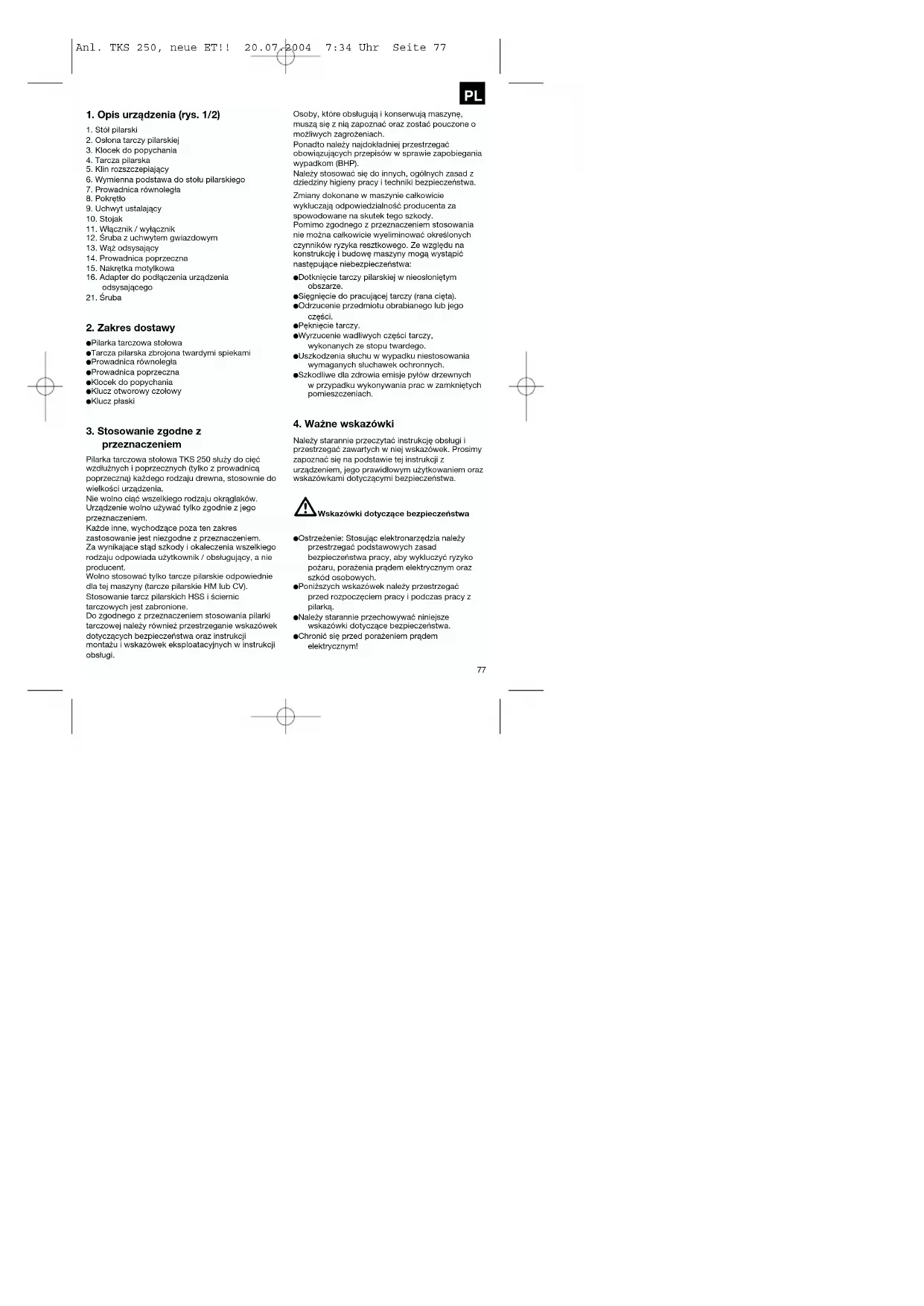 Należy starannie przeczytać instrukcję obsługi i przestrzegać zawartych w niej wskazówek. Prosimy zapoznać się na podstawie tej instrukcji z urządzeniem, jego prawidłowym użytkowaniem oraz wskazówkami dotyczącymi bezpieczeństwa. Wskazówki dotyczące bezpieczeństwa Ostrzeżenie: Stosując elektronarzędzia należy przestrzegać podstawowych zasad bezpieczeństwa pracy, aby wykluczyć ryzyko pożaru, porażenia prądem elektrycznym oraz szkód osobowych. Poniższych wskazówek należy przestrzegać przed rozpoczęciem pracy i podczas pracy z pilarką. Należy starannie przechowywać niniejsze wskazówki dotyczące bezpieczeństwa. Chronić się przed porażeniem prądem elektrycznym! Anl. TKS 250, neue ET!! 20.07.2004 7:34 Uhr Seite 77 Nie należy dotykać ciałem uziemionych części urządzenia. Nieużywane urządzenia należy przechowywać w suchym, zamykanym na klucz i niedostępnym dla dzieci pomieszczeniu. Dbać o czystość i dobre naostrzenie narzędzi, aby móc lepiej i bezpieczniej wykonywać pracę. Regularnie kontrolować przewód zasilający narzędzia i w razie uszkodzenia zlecić jego wymianę autoryzowanemu fachowcowi. Kontrolować regularnie przedłużacze, a w razie uszkodzenia wymienić. Na wolnym powietrzu wolno stosować tylko dopuszczone do tego i odpowiednio oznaczone przedłużacze. Koncentrować się na wykonywanej pracy. Przy pracy zachować rozsądek. Nie używać narzędzia, jeżeli jest się zmęczonym. Nie używać elektronarzędzi, jeżeli nie działa ich wyłącznik. Ostrzeżenie! Używanie innych, zastępczych narzędzi lub wyposażenia dodatkowego może oznaczać niebezpieczeństwo obrażeń użytkownika. Podczas każdej czynności regulacyjnej i konserwacyjnej wyciągnąć wtyczkę przewodu zasilającego z gniazda sieciowego. Prosimy o przekazanie wskazówek dotyczących bezpieczeństwa wszystkim osobom, pracującym z niniejszym urządzeniem. Nie używać pilarki do cięcia drewna opałowego. Nie wolno wykonywać cięć poprzecznych na okrąglakach. Ostrożnie! Wirująca tarcza pilarska stwarza niebezpieczeństwo okaleczenia rąk i palców. Urządzenie wyposażone jest w wyłącznik bezpieczeństwa (11) zabezpieczający przed ponownym włączeniem po spadku napięcia. Przed uruchomieniem sprawdzić, czy napięcie na tabliczce znamionowej urządzenia jest zgodne z napięciem sieciowym. Jeśli potrzebny jest przedłużacz, upewnić się, czy ma on wystarczający przekrój dla prądu pobieranego przez pilarkę. Minimalny przekrój 1 mm2.. Bęben kablowy stosować tylko w stanie rozwiniętym. Nie nosić pilarki trzymając za kabel zasilający. Sprawdzić kabel zasilający. Nie używać do podłączania uszkodzonych kabli zasilających. Nie ciągnąć za kabel zasilający w celu wyciągnięcia wtyczki z gniazda sieciowego. Chronić kabel zasilający przed wysoką temperaturą, olejami i ostrymi krawędziami. Nie narażać pilarki na działanie deszczu i nie używać w wilgotnym lub mokrym otoczeniu. Zadbać o dobre oświetlenie stanowiska pracy. Nie piłować w pobliżu palnych cieczy lub gazów. Nosić odpowiednie ubranie robocze! Wirująca tarcza pilarska może zaczepić za obszerne ubranie lub biżuterię. Podczas prac na wolnym powietrzu zaleca się noszenie obuwia z profilowaną podeszwą. W przypadku długich włosów należy nałożyć siatkę na włosy. Unikać nienormalnych pozycji ciała. Osoba obsługująca musi mieć ukończone co najmniej 18 lat, uczniowie odbywający przyuczenie do zawodu min. 16 lat, ale tylko pod nadzorem. Nie dopuszczać dzieci do podłączonego do sieci urządzenia. Usuwać z miejsca pracy odpadki drewna i rozrzucone części. Nieporządek w miejscu pracy może być przyczyną wypadków. Nie pozwolić żeby osoby postronne, a szczególnie dzieci dotykały urządzenie lub kabel zasilający. Nie dopuszczać ich do stanowiska pracy. Nie wolno odwracać uwagi osób pracujących przy maszynie. Zwrócić uwagę na kierunek obrotów silnika i tarczy pilarskiej. Po wyłączeniu napędu nie wolno nigdy hamować tarcz pilarskich (4) naciskając z boku. Zakładać tylko dobrze naostrzone tarcze pilarskie (4), nie posiadające rysów i deformacji. Nie stosować tarcz pilarskich (4) wykonanych z wysokostopowych stali szybkotnących (stal HSS). Stosować do maszyny tylko narzędzia, które odpowiadają wymogom normy prEN 847- 1:1996. Natychmiast wymienić wadliwe tarcze pilarskie (4). Nie stosować tarcz pilarskich, które nie odpowiadają parametrom podanym w niniejszej instrukcji obsługi. Ruchomy kołpak osłony tarczy pilarskiej (2) nie może być zamocowany w stanie otwartym. Nie wolno demontować ani niszczyć urządzeń zabezpieczających (2, 5) na maszynie. Klin rozszczepiający jest ważnym elementem zabezpieczającym, który prowadzi przedmiot przecinany za tarczą pilarską oraz przedmiotu przecinanego. Uważać na właściwą grubość klina rozszczepiającego. Klin rozszczepiający nie powinien być cieńszy niż korpus tarczy