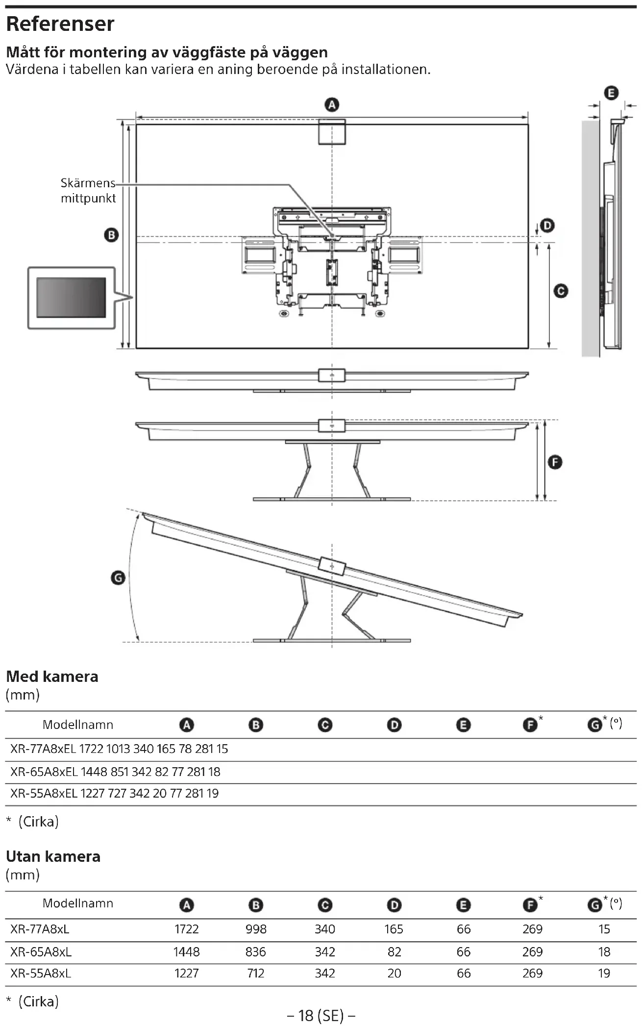 Materiały pomocnicze Wymiary do instalacji uchwytu ściennego na ścianie Wartości podane w tabeli mogą się różnić minimalnie w zależności od instalacji. Środkowy punkt ekranu Z kamerą (mm) Nazwa modelu