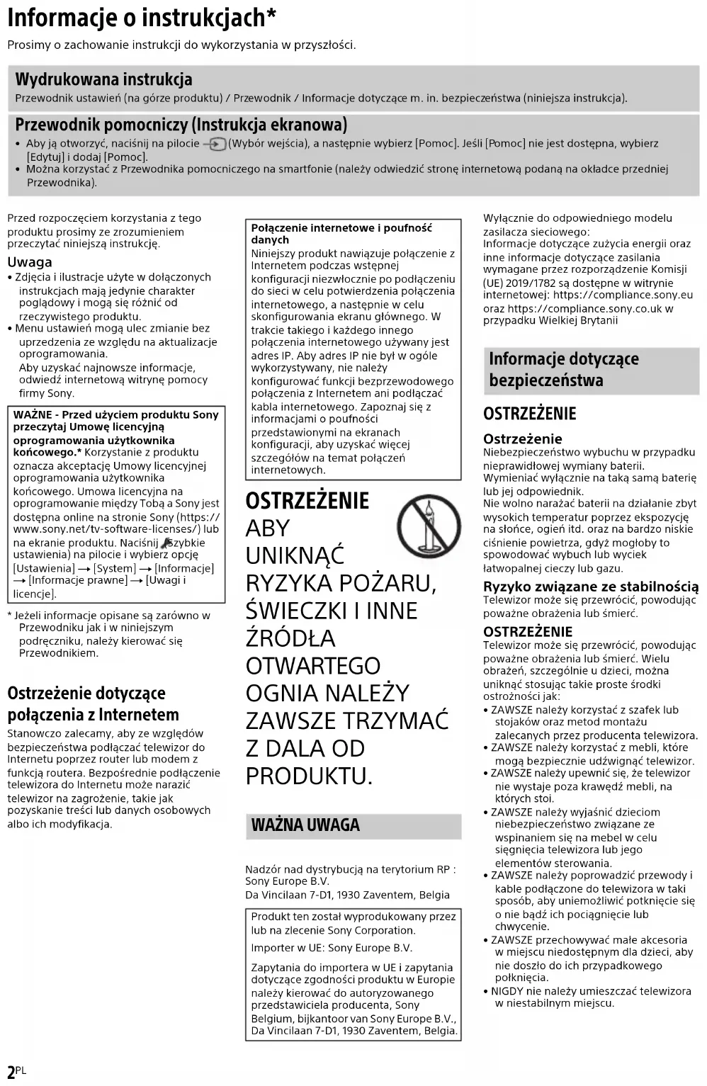 PRODUKTU. Nadzór nad dystrybucją na terytorium RP :Sony Europe B.V.Da Vincilaan 7-D1, 1930 Zaventem, BelgiaWyłącznie do odpowiedniego modelu zasilacza sieciowego:Informacje dotyczące zużycia energii oraz inne informacje dotyczące zasilania wymagane przez rozporządzenie Komisji (UE) 2019/1782 są dostępne w witrynie internetowej: https://compliance.sony.eu oraz https://compliance.sony.co.uk w przypadku Wielkiej Brytanii OSTRZEŻENIE Ostrzeżenie Niebezpieczeństwo wybuchu w przypadku nieprawidłowej wymiany baterii. Wymieniać wyłącznie na taką samą baterię lub jej odpowiednik.Nie wolno narażać baterii na działanie zbyt wysokich temperatur poprzez ekspozycję na słońce, ogień itd. oraz na bardzo niskie ciśnienie powietrza, gdyż mogłoby to spowodować wybuch lub wyciek łatwopalnej cieczy lub gazu. Ryzyko związane ze stabilnością Telewizor może się przewrócić, powodując poważne obrażenia lub śmierć. OSTRZEŻENIE Telewizor może się przewrócić, powodując poważne obrażenia lub śmierć. Wielu obrażeń, szczególnie u dzieci, można uniknąć stosując takie proste środki ostrożności jak:• ZAWSZE należy korzystać z szafek lub stojaków oraz metod montażu zalecanych przez producenta telewizora.• ZAWSZE należy korzystać z mebli, które mogą bezpiecznie udźwignąć telewizor.• ZAWSZE należy upewnić się, że telewizor nie wystaje poza krawędź mebli, na których stoi.• ZAWSZE należy wyjaśnić dzieciom niebezpieczeństwo związane ze wspinaniem się na mebel w celu sięgnięcia telewizora lub jego elementów sterowania.• ZAWSZE należy poprowadzić przewody i kable podłączone do telewizora w taki sposób, aby uniemożliwić potknięcie się o nie bądź ich pociągnięcie lub chwycenie.• ZAWSZE przechowywać małe akcesoria w miejscu niedostępnym dla dzieci, aby nie doszło do ich przypadkowego połknięcia.• NIGDY nie należy umieszczać telewizora w niestabilnym miejscu. Informacje o instrukcjach* Prosimy o zachowanie instrukcji do wykorzystania w przyszłości. Wydrukowana instrukcja Przewodnik ustawień (na górze produktu) / Przewodnik / Informacje dotyczące m. in. bezpieczeństwa (niniejsza instrukcja). Przewodnik pomocniczy (Instrukcja ekranowa)