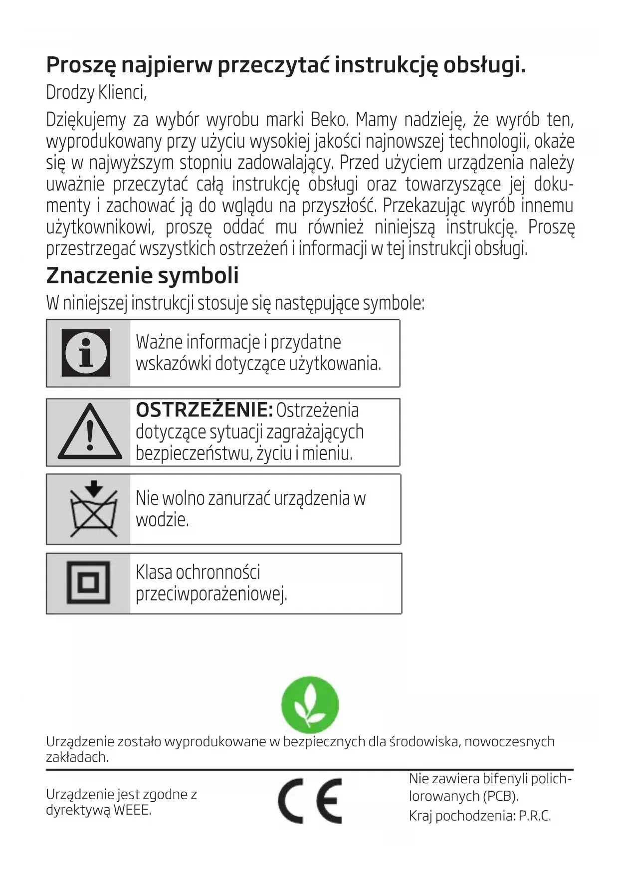 - Cihazın düşürülmesi durumunda cihaz çalışmayabilir veya kalıcı hasar oluşabilir.Proszę najpierw przeczytać instrukcję obsługi. Drodzy Klienci, Dziękujemy za wybór wyrobu marki Beko. Mamy nadzieję, że wyrób ten, wyprodukowany przy użyciu wysokiej jakości najnowszej technologii, okaże się w najwyższym stopniu zadowalający. Przed użyciem urządzenia należy uważnie przeczytać całą instrukcję obsługi oraz towarzyszące jej doku- menty i zachować ją do wglądu na przyszłość. Przekazując wyrób innemu użytkownikowi, proszę oddać mu również niniejszą instrukcję. Proszę przestrzegać wszystkich ostrzeżeń i informacji w tej instrukcji obsługi. Znaczenie symboli W niniejszej instrukcji stosuje się następujące symbole: