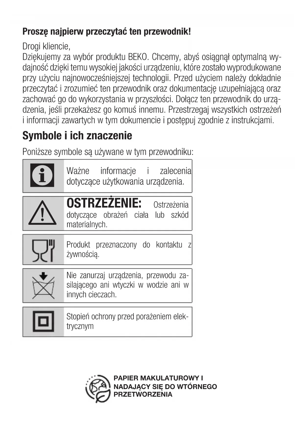 Prima di contattare l’assistenza tecnica, al fine di agevolare la gestione della chiamata, è necessario avere a portata di mano il modello del prodotto e il documento fiscale di acquisto.Proszę najpierw przeczytać ten przewodnik! Drogi kliencie, Dziękujemy za wybór produktu BEKO. Chcemy, abyś osiągnął optymalną wy- dajność dzięki temu wysokiej jakości urządzeniu, które zostało wyprodukowane przy użyciu najnowocześniejszej technologii. Przed użyciem należy dokładnie przeczytać i zrozumieć ten przewodnik oraz dokumentację uzupełniającą oraz zachować go do wykorzystania w przyszłości. Dołącz ten przewodnik do urzą- dzenia, jeśli przekażesz go komuś innemu. Przestrzegaj wszystkich ostrzeżeń i informacji zawartych w tym dokumencie i postępuj zgodnie z instrukcjami. Symbole i ich znaczenie Poniższe symbole są używane w tym przewodniku: