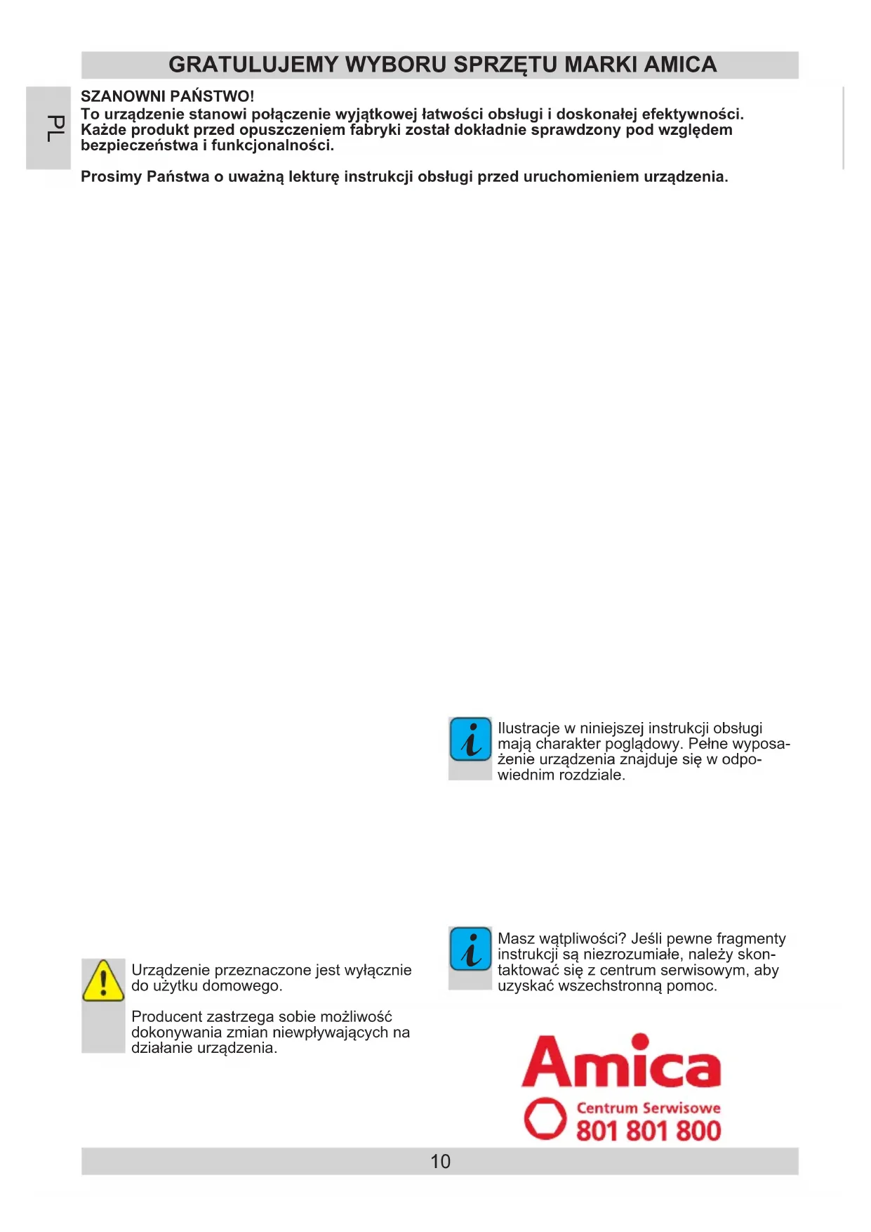Gwarancja Świadczenia gwarancyjne wg karty gwarancyjnej. Producent nie odpowiada za jakiekolwiek szkody spowodowane nieprawidłowym po stę po wa niem z wy- robem. Obsługaposprzedażna W przypadku gdy zaistnieją jakiekolwiek problemy związane z użytkowaniem sprzętu Amica to nasze CENTRUM SERWISOWE zapewni Państwu szybką i w pełni profesjonalną pomoc. Chcemy bowiem wszystkim, którzy zaufali marce Amica zagwarantować pełen komfort ko rzy sta nia z naszego wyrobu. PL22