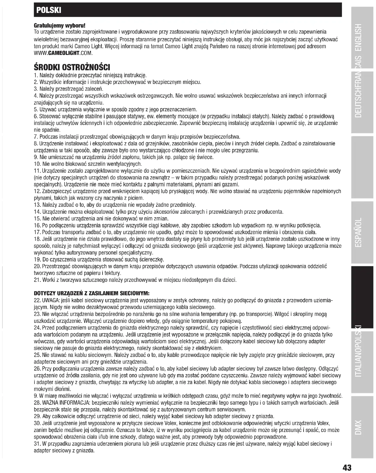 30. Jeśli urządzenie jest wyposażone w przyłącze sieciowe Volex, konieczne jest odblokowanie odpowiedniej wtyczki urządzenia Volex, zanim będzie możliwe jej odłączenie. Oznacza to także, iż w wyniku pociągnięcia za kabel urządzenie może się przesunąć i spaść, co może spowodować obrażenia ciała i/lub inne szkody, dlatego ważne jest, aby przewody były odpowiednio poprowadzone. 31. W przypadku zagrożenia uderzeniem pioruna lub jeśli urządzenie przez dłuższy czas nie jest używane, należy wyjąć kabel sieciowy i adapter sieciowy z gniazda.44 DMX ITALIANO POLSKI ESPAÑOL FRANCAIS DEUTSCHENGLISH 32. Instalacja urządzenia powinna odbywać się, gdy urządzenie nie jest podłączone do źródła zasilania (należy wyjąć wtyczkę z gniazda). 33. Kurz i inne osady wewnątrz urządzenia mogą je uszkodzić. W zależności od warunków otoczenia (kurz, nikotyna, opary itp.) urządzenie powinno być konserwowane lub czyszczone przez wykwalifikowanego specjalistę (usługa nieobjęta gwarancją), aby zapobiec przegrzaniu i nieprawidłowemu działaniu. 34: Odstęp od materiałów łatwopalnych musi wynosić co najmniej 0,5 m. 35. Powierzchnia przekroju poprzecznego przewodów zasilających większą liczbę urządzeń musi wynosić co najmniej 1,5 mm². W krajach Unii Europejskiej przewody muszą spełniać wymagania normy H05VV-F lub podobne wytyczne. Adam Hall oferuje odpowiednie przewody. Używając tych przewodów można podłączyć większą liczbę urządzeń przez złącze Power out i Power in kolejnego urządzenia. Należy upew- nić się, że całkowity pobór mocy wszystkich podłączonych urządzeń nie przekracza wartości podanej w amperach na urządzeniu. Należy dopilnować, aby kable łączące poszczególne urządzenia były możliwie jak najkrótsze. 36. Urządzenie nie może być używane przez osoby (w tym dzieci) o ograniczonych możliwościach fizycznych, sensorycznych lub um- ysłowych, a także nieposiadające doświadczenia i wiedzy.
