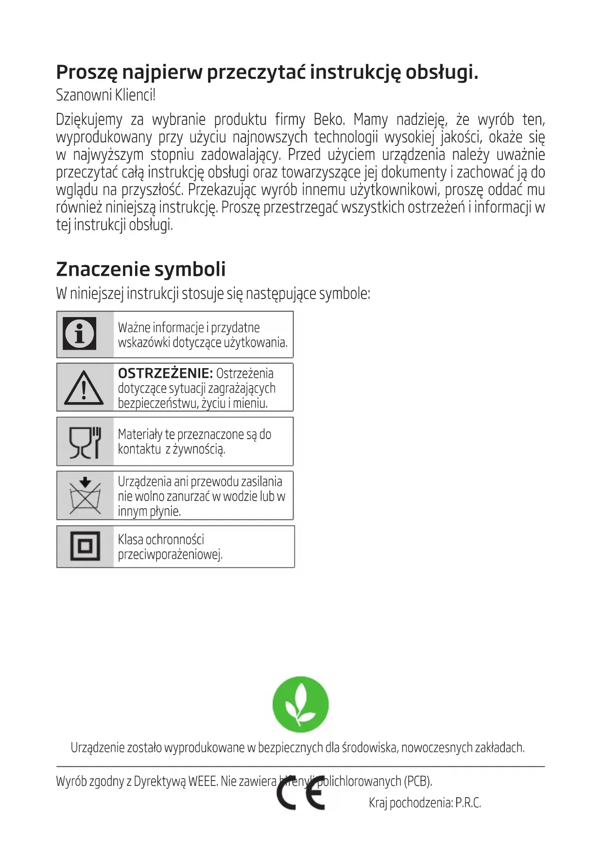 Proszę najpierw przeczytać instrukcję obsługi. Szanown Klenc! Dzękujemy za wybrane produktu frmy Beko. Mamy nadzeję, że wyrób ten, wyprodukowany przy użycu najnowszych technolog wysokej jakośc, okaże sę w najwyższym stopnu zadowalający. Przed użycem urządzena należy uważne przeczytać całą nstrukcję obsług oraz towarzyszące jej dokumenty zachować ją do wglądu na przyszłość. Przekazując wyrób nnemu użytkownkow, proszę oddać mu równeż nnejszą nstrukcję. Proszę przestrzegać wszystkch ostrzeżeń nformacj w tej nstrukcj obsług. Znaczenie symboli W nnejszej nstrukcj stosuje sę następujące symbole: