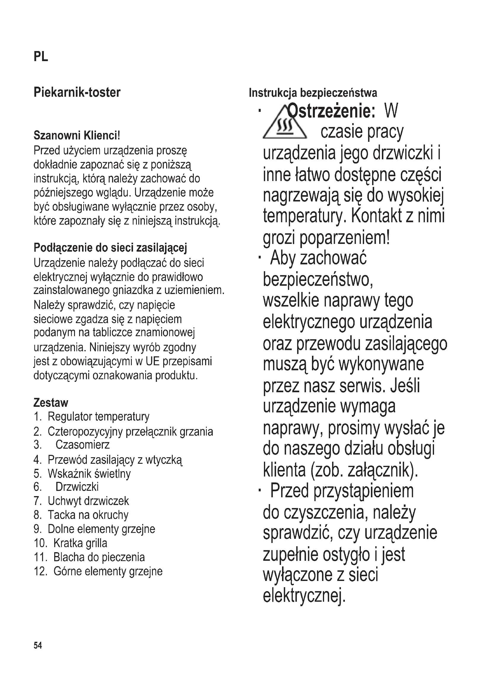 Instrukcja bezpieczeństwa ∙ Ostrzeżenie: W czasie pracy urządzenia jego drzwiczki i inne łatwo dostępne części nagrzewają się do wysokiej temperatury. Kontakt z nimi grozi poparzeniem! ∙ Aby zachować bezpieczeństwo, wszelkie naprawy tego elektrycznego urządzenia oraz przewodu zasilającego muszą być wykonywane przez nasz serwis. Jeśli urządzenie wymaga naprawy, prosimy wysłać je do naszego działu obsługi klienta (zob. załącznik). ∙ Przed przystąpieniem do czyszczenia, należy sprawdzić, czy urządzenie zupełnie ostygło i jest wyłączone z sieci elektrycznej. PL104 x 142 mm