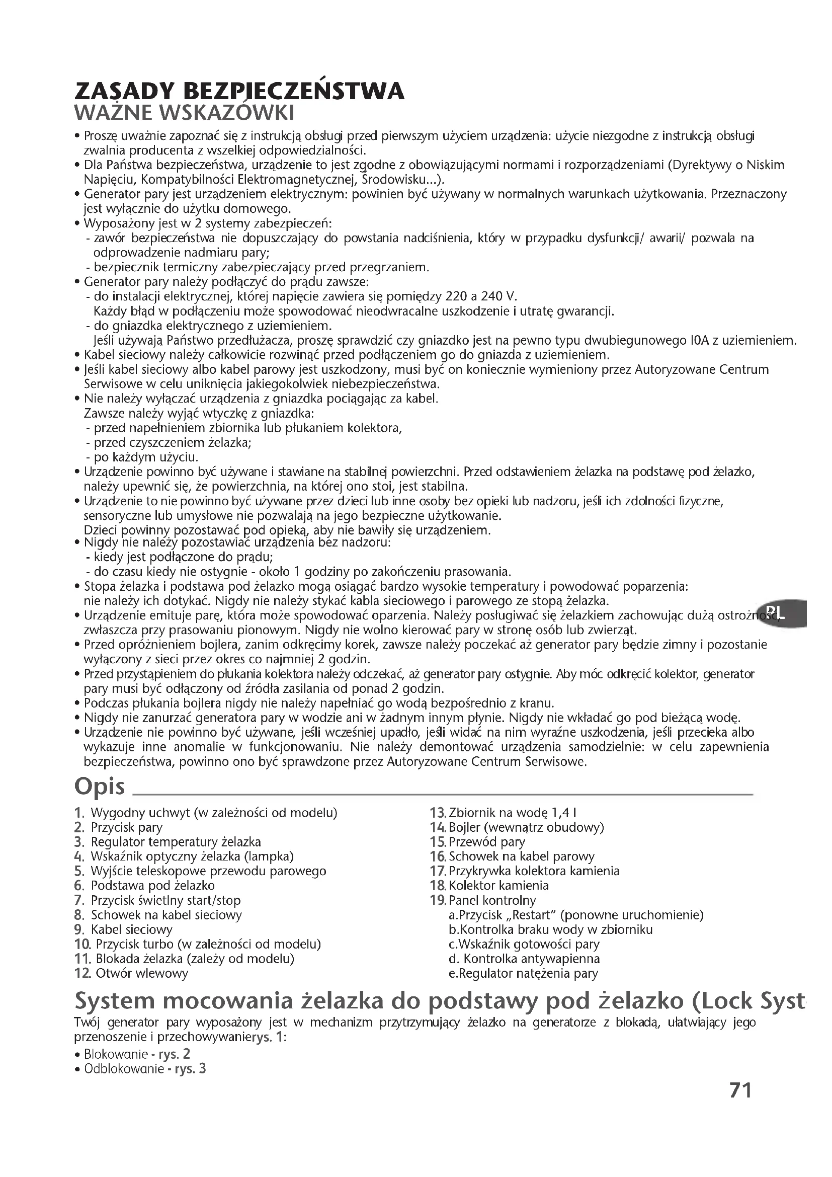 - Urzàdzenie nie powinno byç u˝ywane, jeÊli wczeÊniej upad∏o, jeÊli widaç na nim wyraêne uszkodzenia, jeÊli przecieka albo wykazuje inne anomalie w funkcjonowaniu. Nie nale˝y demontowaç urzàdzenia samodzielnie: w celu zapewnieniabezpieczeƒstwa, powinno ono byç sprawdzone przez Autoryzowane Centrum Serwisowe. Wygodny uchwyt (w zale˝noÊci od modelu) Przycisk pary Regulator temperatury ˝elazka Wskaênik optyczny ˝elazka (lampka) WyjÊcie teleskopowe przewodu parowego Podstawa pod ˝elazko Przycisk Êwietlny start/stop Schowek na kabel sieciowy Kabel sieciowy Przycisk turbo (w zale˝noÊci od modelu) Blokada ˝elazka (zale˝y od modelu) Otwór wlewowy Zbiornik na wod´ 1,4 l Bojler (wewnàtrz obudowy) Przewód pary Schowek na kabel parowy Przykrywka kolektora kamienia Kolektor kamienia Panel kontrolnya.Przycisk „Restart” (ponowne uruchomienie)b.Kontrolka braku wody w zbiornikuc.Wskaênik gotowoÊci paryd. Kontrolka antywapiennae.Regulator nat´˝enia pary Opis System mocowania ˝elazka do podstawy pod elazko (Lock System) Twój generator pary wyposa˝ony jest w mechanizm przytrzymujàcy ˝elazko na generatorze z blokadà, u∏atwiajàcy jego przenoszenie i przechowywanie - rys. 1