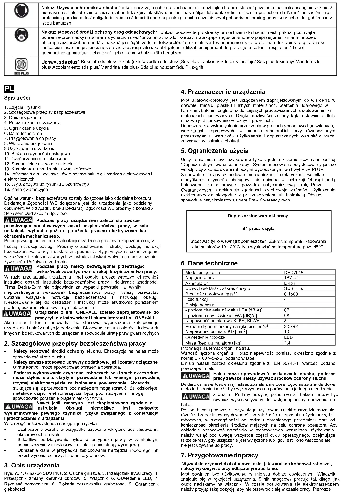 Ogólne warunki bezpieczeństwa zostały dołączone jako oddzielna broszura. Deklaracja Zgodności WE dołączona jest do urządzenia jako oddzielny dokument. W przypadku braku Deklaracji Zgodności WE prosimy o kontakt z Serwisem Dedra-Exim Sp. z o.o. Podczas pracy urządzeniem zaleca się zawsze przestrzegać podstawowych zasad bezpieczeństwa pracy, w celu uniknięcia wybuchu pożaru, porażenia prądem elektrycznym lub obrażenia mechanicznego. Przed przystąpieniem do eksploatacji urządzenia prosimy o zapoznanie się z treścią Instrukcji obsługi. Prosimy o zachowanie Instrukcji obsługi, instrukcji bezpieczeństwa pracy i deklaracji zgodności. Rygorystyczne przestrzeganie wskazówek i zaleceń zawartych w Instrukcji obsługi wpłynie na przedłużenie żywotności Państwa urządzenia. Podczas pracy należy bezwzględnie przestrzegać wskazówek zawartych w instrukcji bezpieczeństwa pracy. W razie przekazania urządzenia innej osobie, proszę wręczyć jej również instrukcję obsługi, instrukcje bezpieczeństwa pracy i deklarację zgodności. Firma Dedra-Exim nie odpowiada za wypadki powstałe w wyniku nieprzestrzegania wskazówek bezpieczeństwa pracy. Należy przeczytać uważnie wszystkie instrukcje bezpieczeństwa i instrukcję obsługi. Niestosowanie się do ostrzeżeń i instrukcji może skutkować porażeniem prądem, pożarem i/lub poważnymi obrażeniami. Urządzenie z linii ONE+ALL zostało zaprojektowane do pracy tylko z ładowarkami i akumulatorami linii ONE+ALL. Akumulator Li-Ion i ładowarka nie stanowią wyposażenia zakupionego urządzenia i należy nabyć je oddzielnie. Stosowanie akumulatorów i ładowarek innych niż dedykowanych do urządzenia spowoduje utratę praw gwarancyjnych