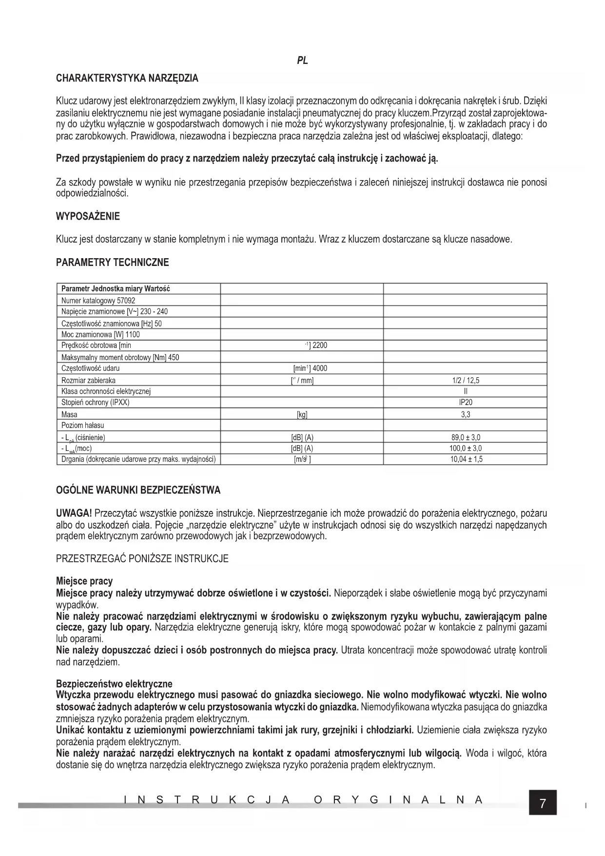 Klucz udarowy jest elektronarzędziem zwykłym, II klasy izolacji przeznaczonym do odkręcania i dokręcania nakrętek i śrub. Dzięki zasilaniu elektrycznemu nie jest wymagane posiadanie instalacji pneumatycznej do pracy kluczem.Przyrząd został zaprojektowa- ny do użytku wyłącznie w gospodarstwach domowych i nie może być wykorzystywany profesjonalnie, tj. w zakładach pracy i do prac zarobkowych. Prawidłowa, niezawodna i bezpieczna praca narzędzia zależna jest od właściwej eksploatacji, dlatego: Przed przystąpieniem do pracy z narzędziem należy przeczytać całą instrukcję i zachować ją. Za szkody powstałe w wyniku nie przestrzegania przepisów bezpieczeństwa i zaleceń niniejszej instrukcji dostawca nie ponosi odpowiedzialności. WYPOSAŻENIE Klucz jest dostarczany w stanie kompletnym i nie wymaga montażu. Wraz z kluczem dostarczane są klucze nasadowe. PARAMETRY TECHNICZNE Parametr Jednostka miary Wartość Numer katalogowy 57092 Napięcie znamionowe [V~] 230 - 240 Częstotliwość znamionowa [Hz] 50 Moc znamionowa [W] 1100 Prędkość obrotowa [min