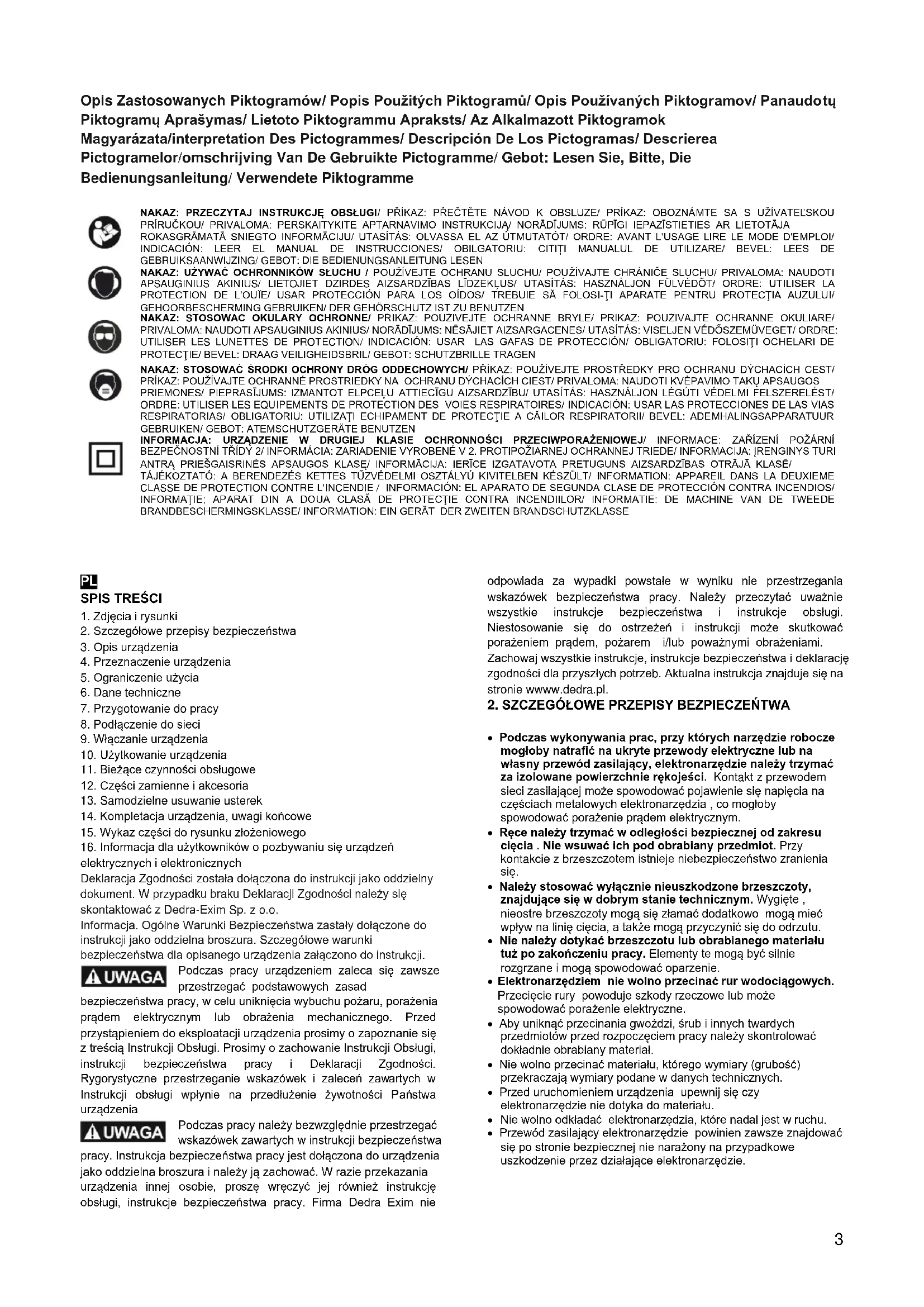 elektrycznych i elektronicznych Deklaracja Zgodności została dołączona do instrukcji jako oddzielny dokument. W przypadku braku Deklaracji Zgodności należy się skontaktować z Dedra-Exim Sp. z o.o. Informacja. Ogólne Warunki Bezpieczeństwa zastały dołączone do instrukcji jako oddzielna broszura. Szczegółowe warunki bezpieczeństwa dla opisanego urządzenia załączono do instrukcji. Podczas pracy urządzeniem zaleca się zawsze przestrzegać podstawowych zasad bezpieczeństwa pracy, w celu uniknięcia wybuchu pożaru, porażenia prądem elektrycznym lub obrażenia mechanicznego. Przed przystąpieniem do eksploatacji urządzenia prosimy o zapoznanie się z treścią Instrukcji Obsługi. Prosimy o zachowanie Instrukcji Obsługi, instrukcji bezpieczeństwa pracy i Deklaracji Zgodności. Rygorystyczne przestrzeganie wskazówek i zaleceń zawartych w Instrukcji obsługi wpłynie na przedłużenie żywotności Państwa urządzenia Podczas pracy należy bezwzględnie przestrzegać wskazówek zawartych w instrukcji bezpieczeństwa pracy. Instrukcja bezpieczeństwa pracy jest dołączona do urządzenia jako oddzielna broszura i należy ją zachować. W razie przekazania urządzenia innej osobie, proszę wręczyć jej również instrukcję obsługi, instrukcje bezpieczeństwa pracy. Firma Dedra Exim nie odpowiada za wypadki powstałe w wyniku nie przestrzegania wskazówek bezpieczeństwa pracy. Należy przeczytać uważnie wszystkie instrukcje bezpieczeństwa i instrukcje obsługi. Niestosowanie się do ostrzeżeń i instrukcji może skutkować porażeniem prądem, pożarem i/lub poważnymi obrażeniami. Zachowaj wszystkie instrukcje, instrukcje bezpieczeństwa i deklarację zgodności dla przyszłych potrzeb. Aktualna instrukcja znajduje się na stronie wwww.dedra.pl.