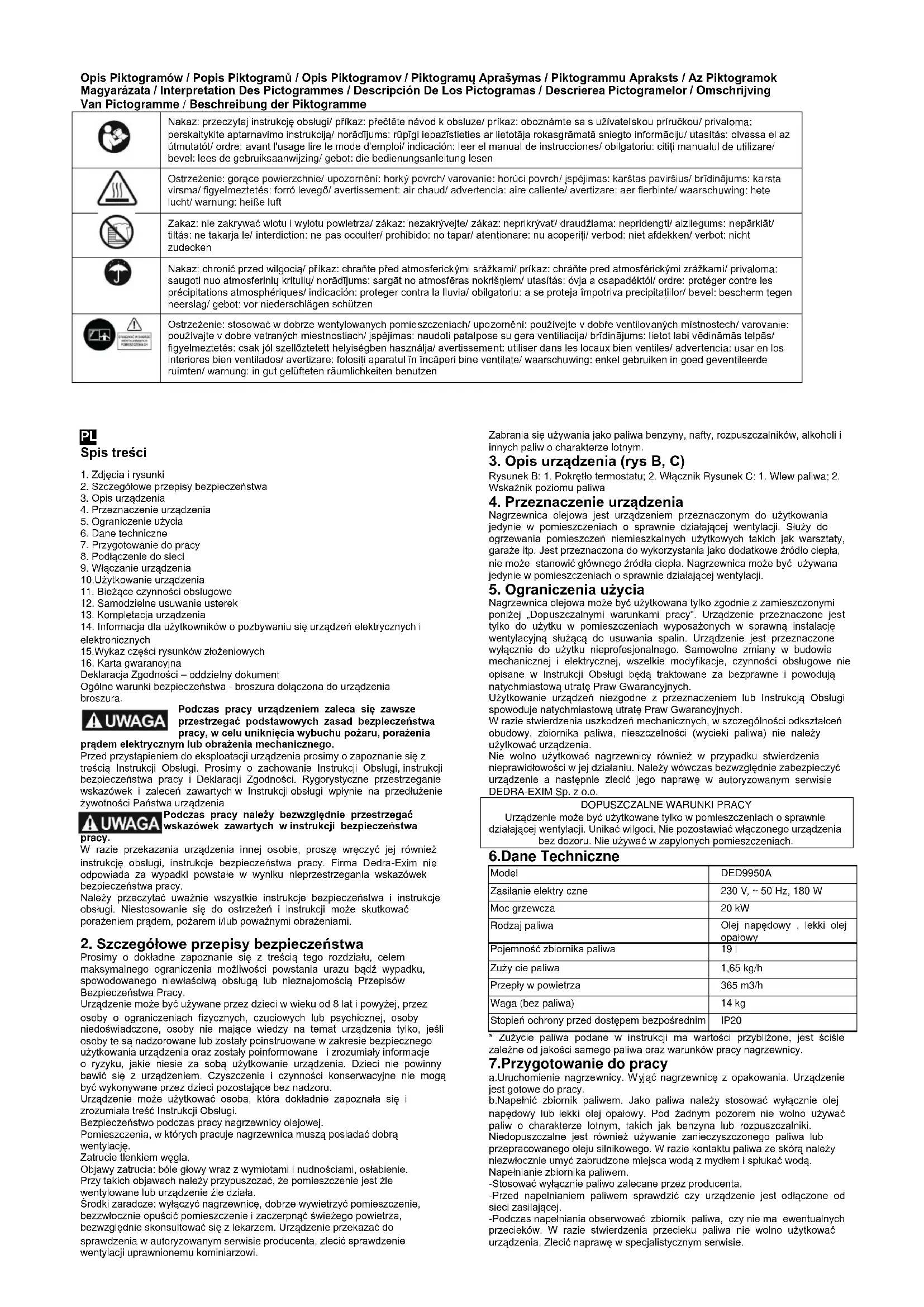 Urządzenie może być użytkowane tylko w pomieszczeniach o sprawnie działającej wentylacji. Unikać wilgoci. Nie pozostawiać włączonego urządzenia bez dozoru. Nie używać w zapylonych pomieszczeniach. 6.Dane Techniczne Model DED9950A Zasilanie elektry czne 230 V, ~ 50 Hz, 180 W Moc grzewcza 20 kW Rodzaj paliwa Olej napędowy , lekki olej opałowy Pojemność zbiornika paliwa 19 l Zuży cie paliwa 1,65 kg/h Przepły w powietrza 365 m3/h Waga (bez paliwa) 14 kg Stopień ochrony przed dostępem bezpośrednim IP20