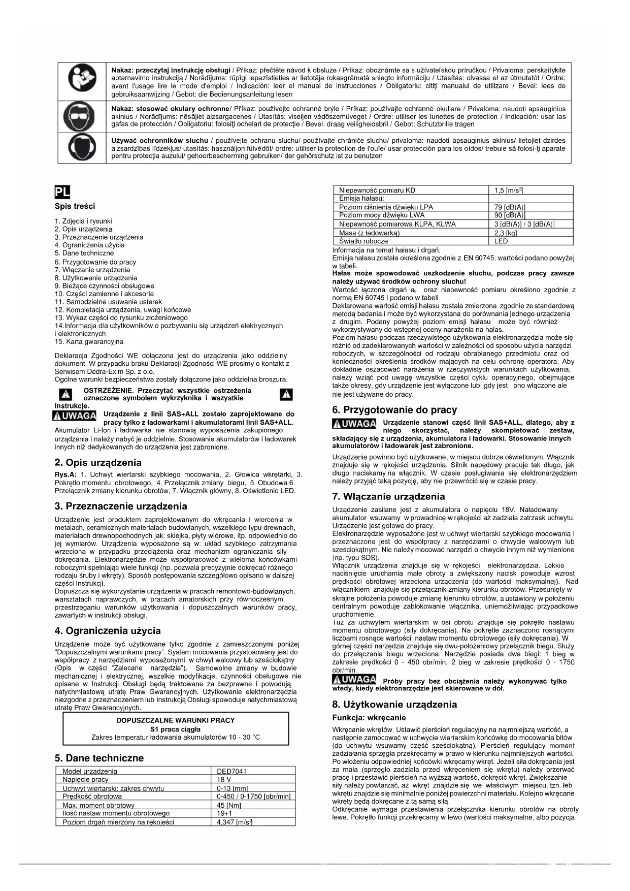 Deklaracja Zgodności WE dołączona jest do urządzenia jako oddzielny dokument. W przypadku braku Deklaracji Zgodności WE prosimy o kontakt z Serwisem Dedra-Exim Sp. z o.o. Ogólne warunki bezpieczeństwa zostały dołączone jako oddzielna broszura. OSTRZEŻENIE. Przeczytać wszystkie ostrzeżenia oznaczone symbolem wykrzyknika i wszystkie instrukcje. Urządzenie z linii SAS+ALL zostało zaprojektowane do pracy tylko z ładowarkami i akumulatorami linii SAS+ALL. Akumulator Li-Ion i ładowarka nie stanowią wyposażenia zakupionego urządzenia i należy nabyć je oddzielnie. Stosowanie akumulatorów i ładowarek innych niż dedykowanych do urządzenia jest zabronione.