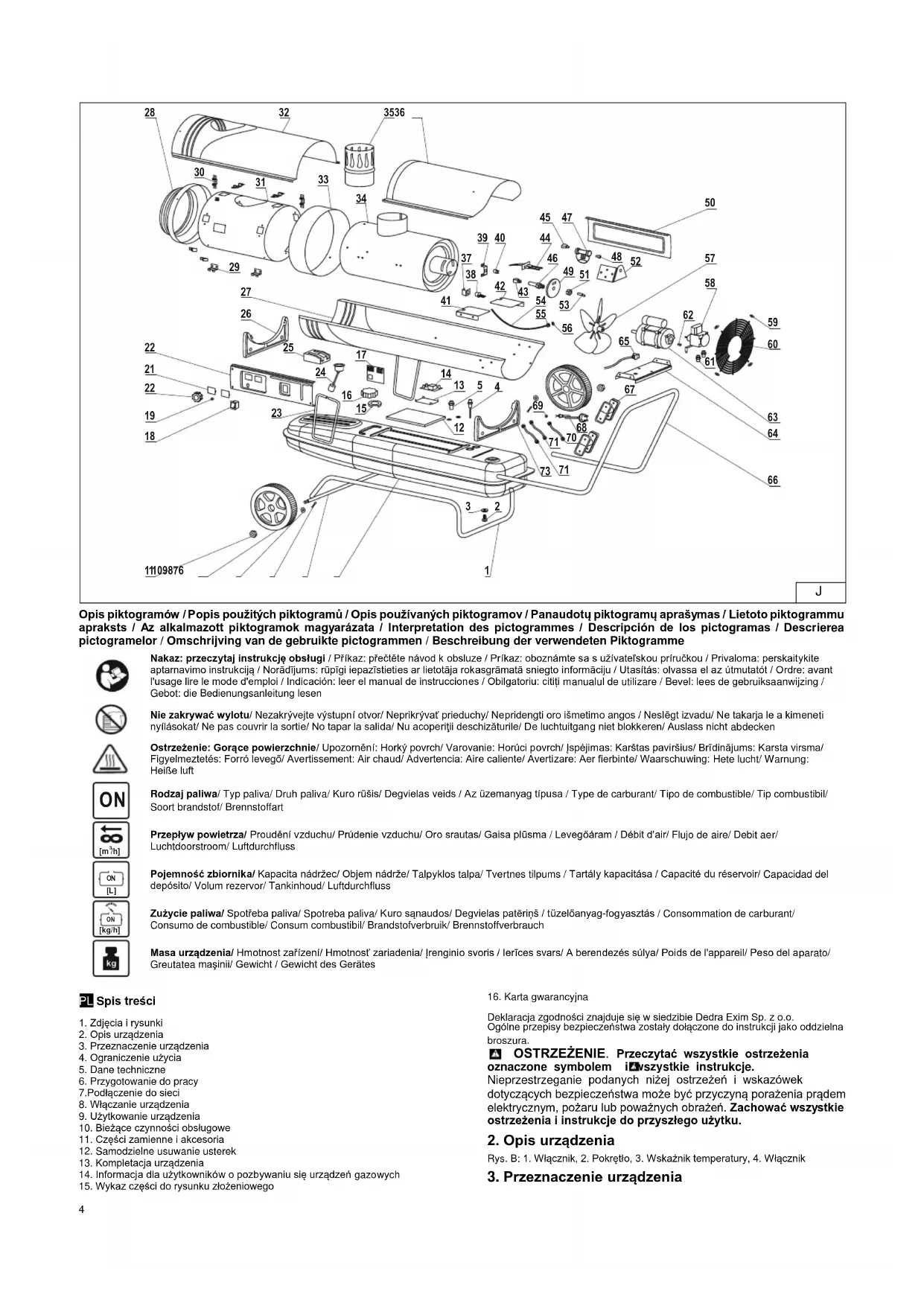 Masa urządzenia/ Hmotnost zařízení/ Hmotnosť zariadenia/ Įrenginio svoris / Ierīces svars/ A berendezés súlya/ Poids de l'appareil/ Peso del aparato/ Greutatea maşinii/ Gewicht / Gewicht des Gerätes PL Spis treści 1. Zdjęcia i rysunki 2. Opis urządzenia 3. Przeznaczenie urządzenia 4. Ograniczenie użycia 5. Dane techniczne 6. Przygotowanie do pracy 7.Podłączenie do sieci 8. Włączanie urządzenia 9. Użytkowanie urządzenia 10. Bieżące czynności obsługowe 11. Części zamienne i akcesoria 12. Samodzielne usuwanie usterek 13. Kompletacja urządzenia