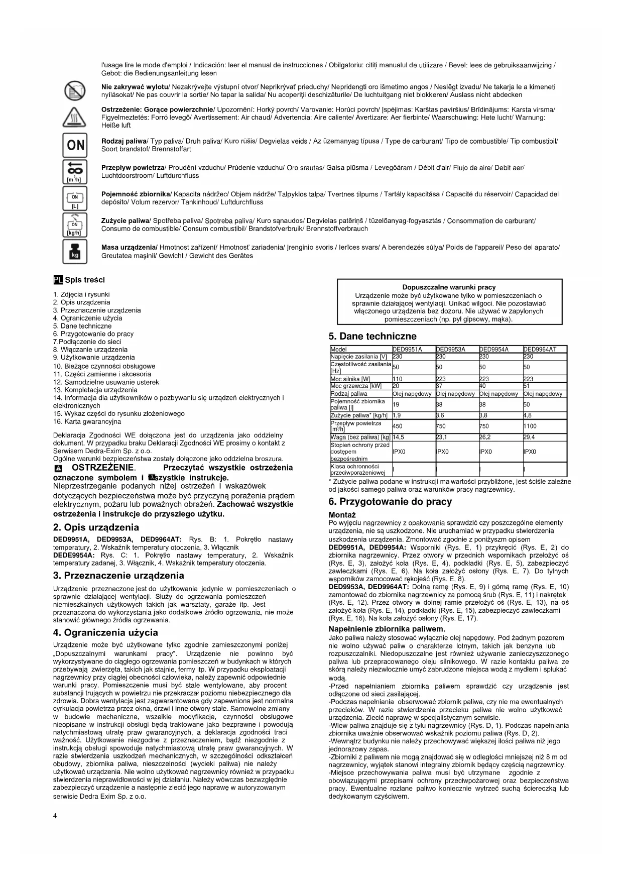 Montaż Po wyjęciu nagrzewnicy z opakowania sprawdzić czy poszczególne elementy urządzenia, nie są uszkodzone. Nie uruchamiać w przypadku stwierdzenia uszkodzenia urządzenia. Zmontować zgodnie z poniżyszm opisem DED9951A, DED9954A: Wsporniki (Rys. E, 1) przykręcić (Rys. E, 2) do zbiornika nagrzewnicy. Przez otwory w przednich wspornikach przełożyć oś (Rys. E, 3), założyć koła (Rys. E, 4), podkładki (Rys. E, 5), zabezpieczyć zawleczkami (Rys. E, 6). Na koła założyć osłony (Rys. E, 7). Do tylnych wsporników zamocować rękojeść (Rys. E, 8). DED9953A, DED9964AT: Dolną ramę (Rys. E, 9) i górną ramę (Rys. E, 10) zamontować do zbiornika nagrzewnicy za pomocą śrub (Rys. E, 11) i nakrętek (Rys. E, 12). Przez otwory w dolnej ramie przełożyć oś (Rys. E, 13), na oś założyć koła (Rys. E, 14), podkładki (Rys. E, 15), zabezpieczyć zawleczkami (Rys. E, 16). Na koła założyć osłony (Rys. E, 17). Napełnienie zbiornika paliwem. Jako paliwa należy stosować wyłącznie olej napędowy. Pod żadnym pozorem nie wolno używać paliw o charakterze lotnym, takich jak benzyna lub rozpuszczalniki. Niedopuszczalne jest również używanie zanieczyszczonego paliwa lub przepracowanego oleju silnikowego. W razie kontaktu paliwa ze skórą należy niezwłocznie umyć zabrudzone miejsca wodą z mydłem i spłukać wodą. -Przed napełnianiem zbiornika paliwem sprawdzić czy urządzenie jest odłączone od sieci zasilającej. -Podczas napełniania obserwować zbiornik paliwa, czy nie ma ewentualnych przecieków. W razie stwierdzenia przecieku paliwa nie wolno użytkować urządzenia. Zlecić naprawę w specjalistycznym serwisie. -Wlew paliwa znajduje się z tyłu nagrzewnicy (Rys. D, 1). Podczas napełniania zbiornika uważnie obserwować wskaźnik poziomu paliwa (Rys. D, 2). -Wewnątrz budynku nie należy przechowywać większej ilości paliwa niż jego jednorazowy zapas. -Zbiorniki z paliwem nie mogą znajdować się w odległości mniejszej niż 8 m od nagrzewnicy, wyjątek stanowi integralny zbiornik będący częścią nagrzewnicy. -Miejsce przechowywania paliwa musi być utrzymane zgodnie z obowiązującymi przepisami ochrony przeciwpożarowej oraz bezpieczeństwa pracy. Ewentualne rozlane paliwo koniecznie wytrzeć suchą ściereczką lub dedykowanym czyściwem.5 Przed uruchomieniem sprawdzić czy nie ma żadnych wycieków paliwa. W przypadku stwierdzenia wycieków paliwa spowodowanego np. nieszczelnością zbiornika lub przewodów paliwowych nie wolno użytkować nagrzewnicy. W takim przypadku należy skontaktować się z serwisem.
