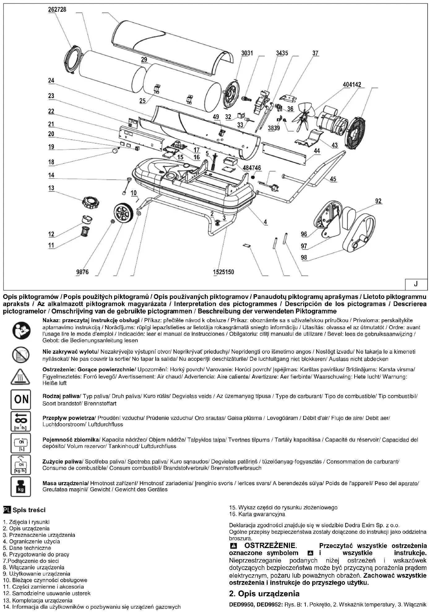 Deklaracja zgodności znajduje się w siedzibie Dedra Exim Sp. z o.o. Ogólne przepisy bezpieczeństwa zostały dołączone do instrukcji jako oddzielna broszura. OSTRZEŻENIE. Przeczytać wszystkie ostrzeżenia oznaczone symbolem i wszystkie instrukcje. Nieprzestrzeganie podanych niżej ostrzeżeń i wskazówek dotyczących bezpieczeństwa może być przyczyną porażenia prądem elektrycznym, pożaru lub poważnych obrażeń. Zachować wszystkie ostrzeżenia i instrukcje do przyszłego użytku.