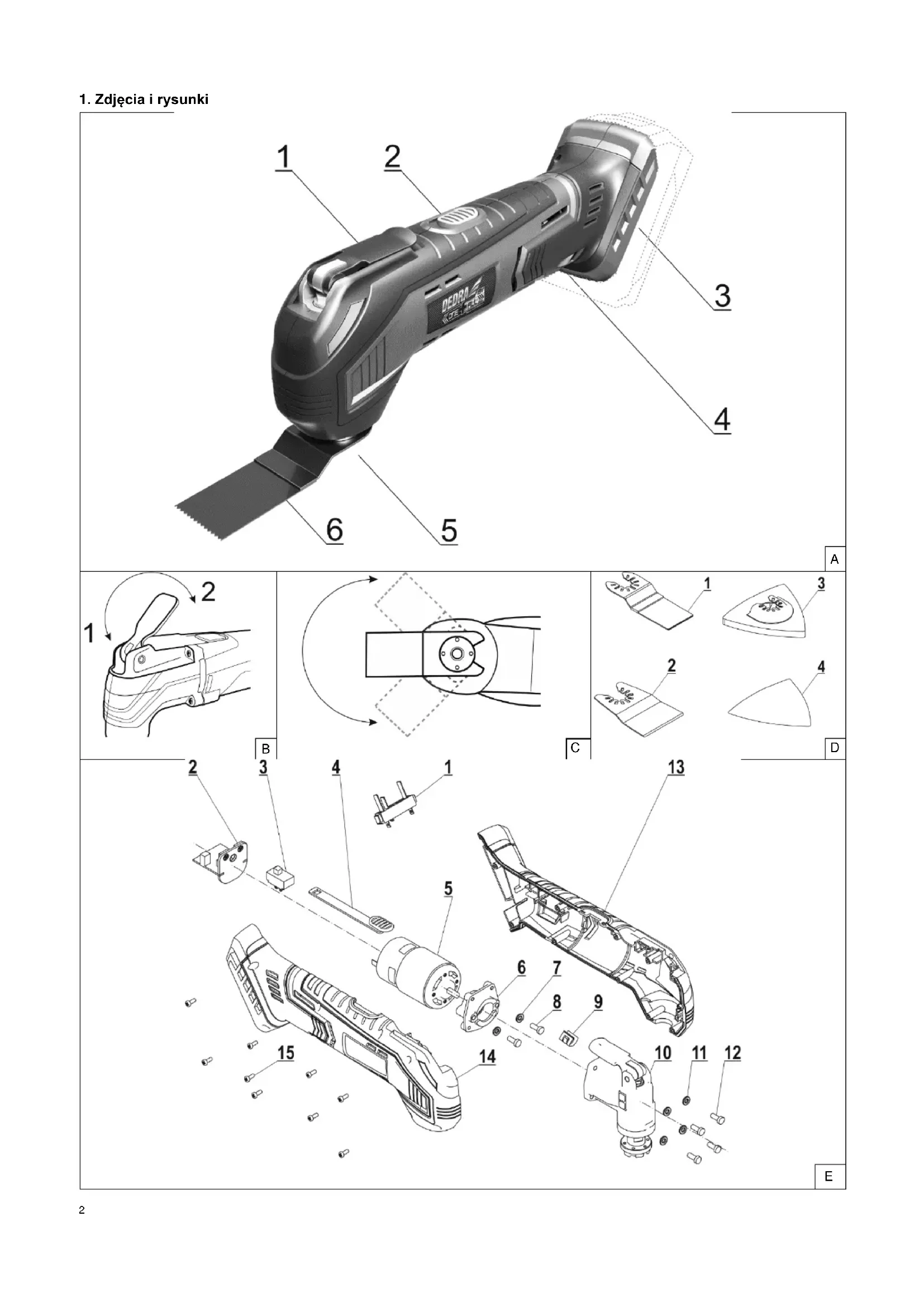 1. Multinarzędzie, 2. Brzeszczot do cięcia, 3. Skrobak, 4. Głowica do