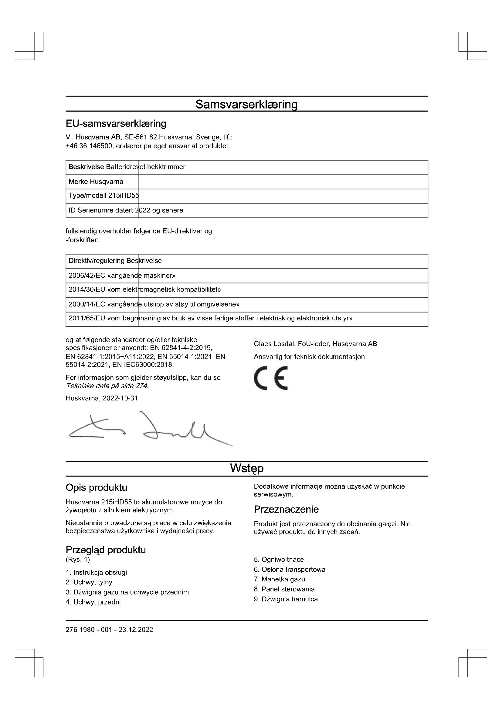 Huskvarna, 2022-10-31 Claes Losdal, FoU-leder, Husqvarna AB Ansvarlig for teknisk dokumentasjon Wstęp Opis produktu Husqvarna 215iHD55 to akumulatorowe nożyce do żywopłotu z silnikiem elektrycznym. Nieustannie prowadzone są prace w celu zwiększenia bezpieczeństwa użytkownika i wydajności pracy. Dodatkowe informacje można uzyskać w punkcie serwisowym. Przeznaczenie Produkt jest przeznaczony do obcinania gałęzi. Nie używać produktu do innych zadań. Przegląd produktu (Rys. 1)