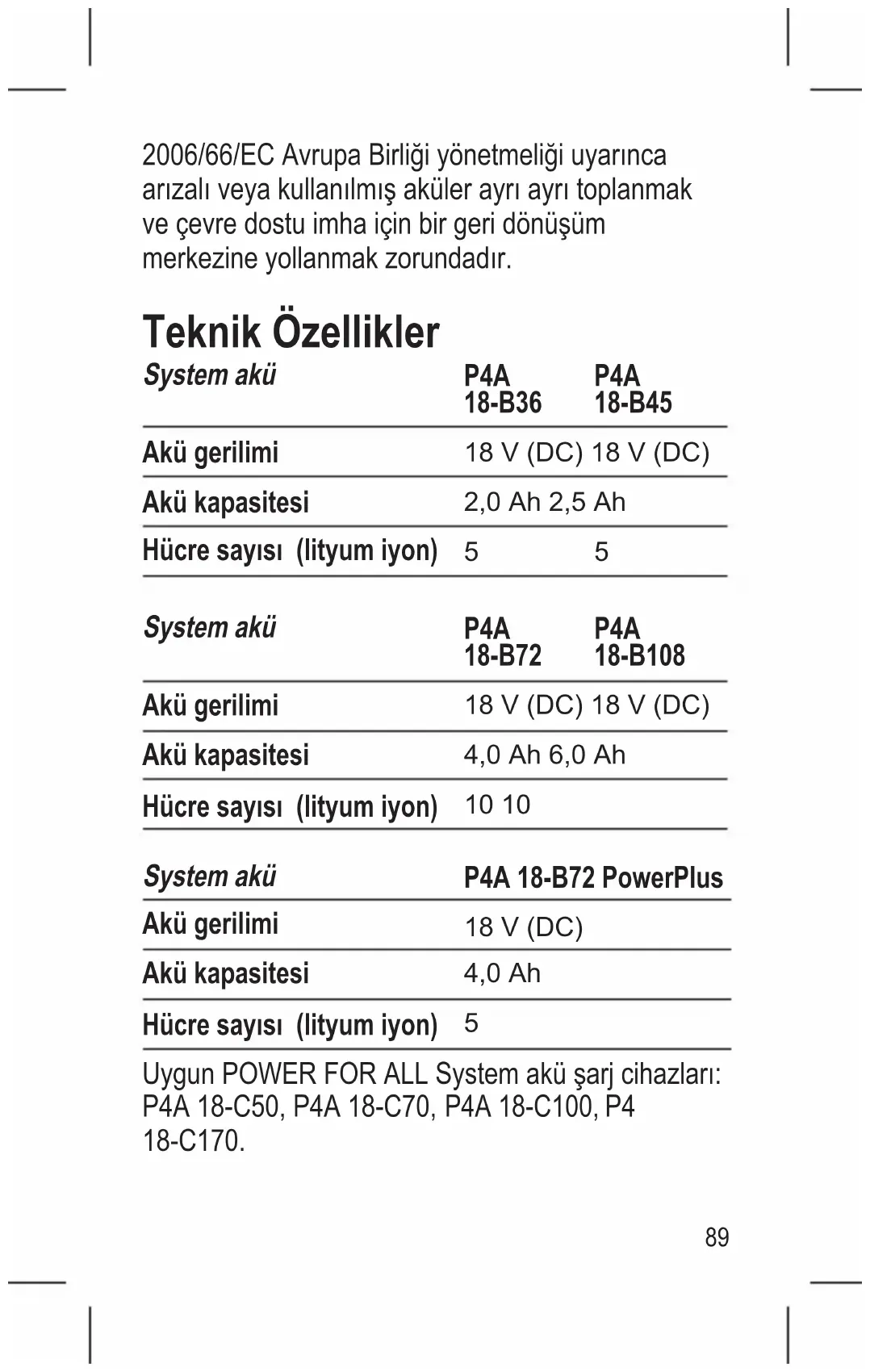 Akumulator systemowy P4A 18-B72 P4A 18-B108 Napięcieakumulatora 18 V (DC) 18 V (DC) Pojemnośćakumulatora 4,0 Ah 6,0 Ah Liczba ogniw (litowo-jonowych)