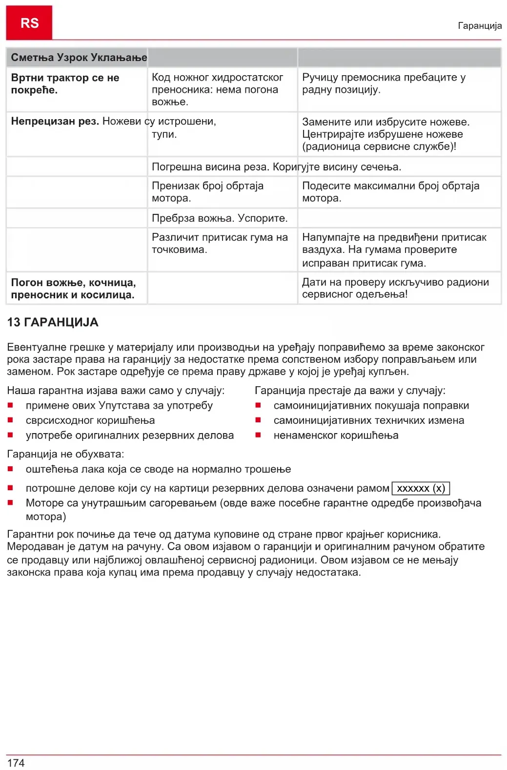 Podczas wykonywania prac związa- nych zkonserwacją, pielęgnacją iczyszczeniem należy zawsze nosić rękawice ochronne! WSKAZÓWKA W przypadku zakłóceń, które nie zostały wymienione w tej tabeli, lub takich, któ- rych nie można usunąć we własnym za- kresie, należy skontaktować się z na- szym działem obsługi klienta. Usterka Przyczyna Usuwanie Silnik nie uruchamia się. Brak paliwa. Napełnić zbiornik; sprawdzić odpowie- trzenie zbiornika; sprawdzić filtr paliwa. Niewłaściwe, zanieczyszczo- ne lub stare paliwo w zbiorni- ku. Należy zawsze używać świeżego paliwa z czystych zbiorników; oczyścić gaźnik (warsztat obsługowo-naprawczy). Zanieczyszczony filtr powie- trza. Przeczyścić filtr powietrza (patrz instruk- cja obsługi producenta silnika). Brak iskry zapłonowej. Przeczyścić świecę zapłonową, w razie potrzeby zamontować nową świecę, sprawdzić kable zapłonowe, sprawdzić układ zapłonu (warsztat obsługowo-na- prawczy). W wyniku kilkukrotnych prób rozruchu za dużo paliwa w komorze spalania silnika. Wykręcić i osuszyć świecę zapłonową. Nie działa rozrusznik. Rozładowany akumulator rozruchowy. Naładować akumulator. Nie działa wyłącznik bezpie- czeństwa przy fotelu kierow- cy. Zająć prawidłową pozycję na fotelu kie- rowcy; uszkodzony wyłącznik.193 Pomoc wprzypadku usterek Usterka Przyczyna Usuwanie Nie działa wyłącznik bezpie- czeństwa w pedale hamulca. Wcisnąć do oporu pedał hamulca. Załączony zespół tnący. Wyłączyć zespół tnący. Bezpiecznik na kablu (+) akumulatora rozruchowego. Sprawdzić bezpiecznik, w razie potrze- by wymienić. Spadająca moc silnika. Za wysoka lub zbyt wilgotna trawa. Skorygować wysokość koszenia; za- pewnić wolną przestrzeń do pracy ze- społu tnącego cofając trochę kosiarkę. Zanieczyszczony filtr powie- trza. Przeczyścić filtr powietrza (patrz instruk- cja obsługi producenta silnika). Nieprawidłowe ustawienie gaźnika. Zlecić sprawdzenie ustawienia (warsztat obsługowo-naprawczy). Mocno zużyty nóż. Wymienić nóż (warsztat obsługowo-na- prawczy). Za duża prędkość jazdy. Zmniejszyć prędkość jazdy. Kosiarka mocno wibruje. Zespół tnący jest uszkodzo- ny. Sprawdzić zespół tnący (warsztat obsłu- gowo-naprawczy). Traktorek ogrodowy nie rusza. W przypadku napędu hydro- statycznego: brak napędu jazdy. Przestawić dźwignię obejścia do położe- nia pracy. Nierówne koszenie. Zużyte lub nieostre noże. Wymienić lub naostrzyć noże. Wyważyć naostrzone noże (warsztat obsługowo- naprawczy)! Nieprawidłowa wysokość ko- szenia. Skorygować wysokość koszenia. Za niskie obroty silnika. Ustawić maksymalne obroty silnika. Za duża prędkość jazdy. Zredukować prędkość jazdy. Różne ciśnienie w oponach. Napompować do uzyskania prawidłowej wartości ciśnienia powietrza. Odczytać na oponie prawidłowe wartości ciśnienia powietrza. Napęd trakcyjny, hamu- lec, sprzęgło i zespół tną- cy. Wszelkie prace serwisowe w zakresie powyższych podzespołów należy wyko- nywać wyłącznie w autoryzowanym punkcie serwisowym!PL