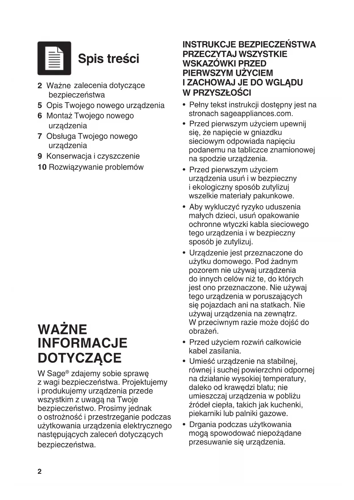Spis treści 2 Ważne zalecenia dotyczące bezpieczeństwa 5 Opis Twojego nowego urządzenia 6 Montaż Twojego nowego urządzenia 7 Obsługa Twojego nowego urządzenia 9 Konserwacja i czyszczenie 10 Rozwiązywanie problemów WAŻNE INFORMACJE DOTYCZĄCE W Sage