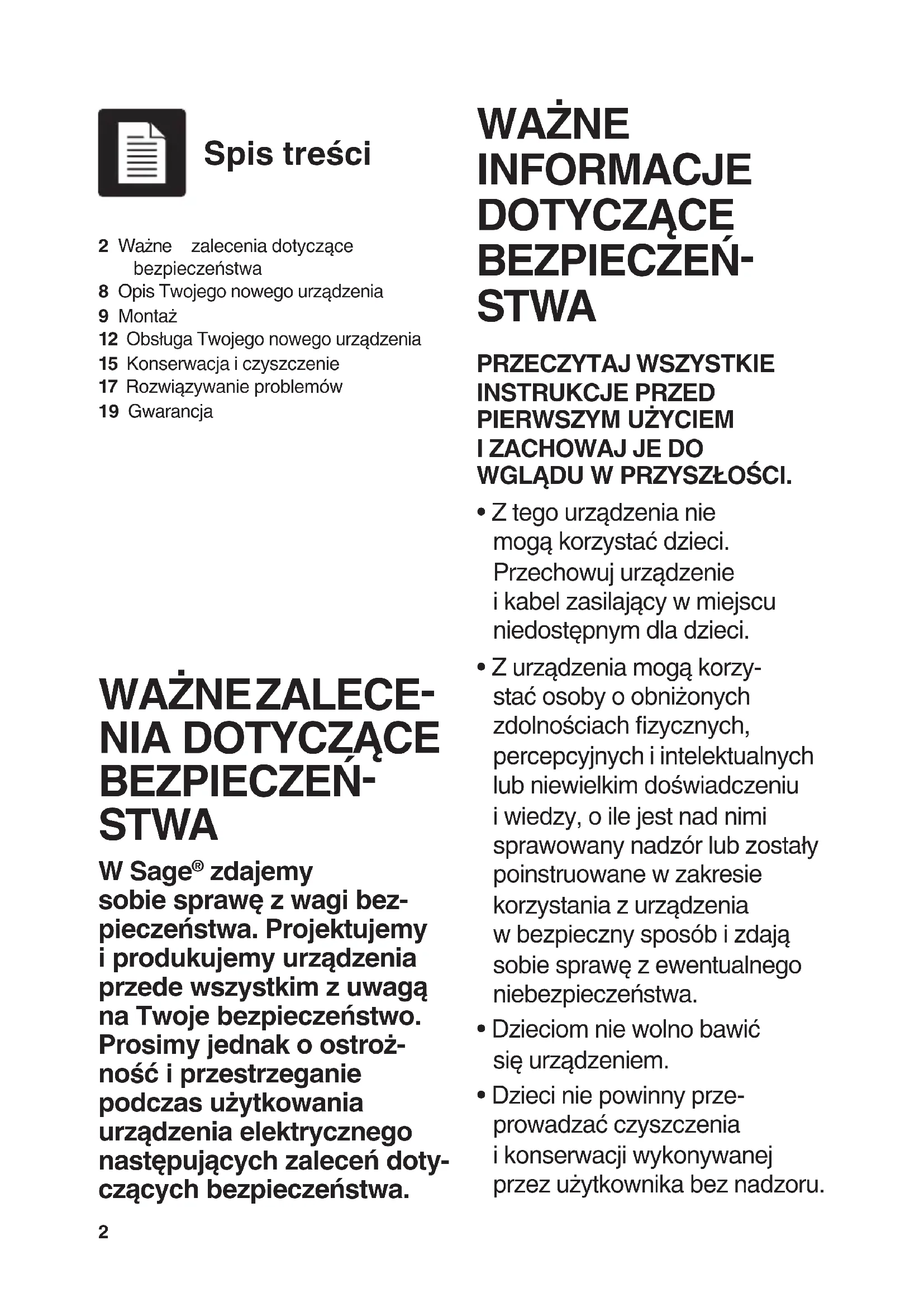 Spis treści WAŻNE ZALECE