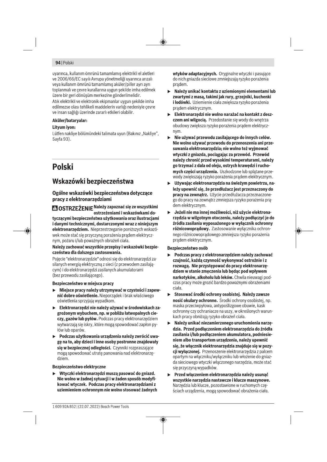 Karasoku Mahallesi 28028. Sokak No:20/A Merkez / ADANA Tel.: +903223599710 -3521379 Fax: +903223591323 E-mail: isiklar@isiklarelektrik.com Diğer servis adreslerini şurada bulabilirsiniz: www.bosch-pt.com/serviceaddresses Nakliye Önerilen Lityum İyon aküler tehlikeli madde taşıma yönetmeliği hükümlerine tabidir. Aküler başka bir yükümlülük olmaksızın kullanıcı tarafından caddeler üzerinde taşınabilir. Üçüncü kişiler eliyle yollanma durumunda (örneğin hava yolu ile veya nakliye şirketleri ile) paketleme ve etiketlemeye ilişkin özel hükümlere uyulmalıdır. Gönderi paketlenirken bir tehlikeli madde uzmanından yardım alınmalıdır. Aküleri sadece ve ancak gövdelerinde hasar yoksa gönderin. Açık kontakları kapatın ve aküyü ambalaj içinde hareket etmeyecek biçimde paketleyin. Lütfen olası ek ulusal yönetmelik hükümlerine de uyun. Tasfiye Elektrikli el aletleri, aküler, aksesuar ve ambalaj malzemesi çevre dostu tasfiye amacıyla bir geri dönüşüm merkezine yollanmalıdır. Elektrikli el aletlerini ve aküleri/bataryaları evsel çöplerin içine atmayın! Sadece AB ülkeleri için: Atık elektrikli ve elektronik cihazlara ilişkin 2012/19/EU sayılı Avrupa yönetmeliği ve ulusal hukuktaki uygulaması Bosch Power Tools 1 609 92A 852 | (22.07.2022)94 | Polski uyarınca, kullanım ömrünü tamamlamış elektrikli el aletleri ve 2006/66/EC sayılı Avrupa yönetmeliği uyarınca arızalı veya kullanım ömrünü tamamlamış aküler/piller ayrı ayrı toplanmalı ve çevre kurallarına uygun şekilde imha edilmek üzere bir geri dönüşüm merkezine gönderilmelidir. Atık elektrikli ve elektronik ekipmanlar uygun şekilde imha edilmezse olası tehlikeli maddelerin varlığı nedeniyle çevre ve insan sağlığı üzerinde zararlı etkileri olabilir. Aküler/bataryalar: Lityum iyon: Lütfen nakliye bölümündeki talimata uyun (Bakınız „Nakliye“, Sayfa93). Polski Wskazówki bezpieczeństwa Ogólne wskazówki bezpieczeństwa dotyczące pracy z elektronarzędziami OSTRZEŻENIE Należy zapoznać się ze wszystkimi ostrzeżeniami i wskazówkami do- tyczącymi bezpieczeństwa użytkowania oraz ilustracjami i danymi technicznymi, dostarczonymi wraz z niniejszym elektronarzędziem. Nieprzestrzeganie poniższych wskazó- wek może stać się przyczyną porażenia prądem elektrycz- nym, pożaru i/lub poważnych obrażeń ciała. Należy zachować wszystkie przepisy i wskazówki bezpie- czeństwa dla dalszego zastosowania. Pojęcie "elektronarzędzie" odnosi się do elektronarzędzi za- silanych energią elektryczną z sieci (z przewodem zasilają- cym) i do elektronarzędzi zasilanych akumulatorami (bezprzewodu zasilającego). Bezpieczeństwo w miejscu pracy u Miejsce pracy należy utrzymywać w czystości i zapew- nić dobre oświetlenie. Nieporządek i brak właściwego oświetlenia sprzyjają wypadkom. u Elektronarzędzi nie należy używać w środowiskach za- grożonym wybuchem, np. w pobliżu łatwopalnych cie- czy, gazów lub pyłów. Podczas pracy elektronarzędziem wytwarzają się iskry, które mogą spowodować zapłon py- łów lub oparów. u Podczas użytkowania urządzenia należy zwrócić uwa- gę na to, aby dzieci i inne osoby postronne znajdowały się w bezpiecznej odległości. Czynniki rozpraszające mogą spowodować utratę panowania nad elektronarzę- dziem. Bezpieczeństwo elektryczne u Wtyczki elektronarzędzi muszą pasować do gniazd. Nie wolno w żadnej sytuacji i w żaden sposób modyfi- kować wtyczek. Podczas pracy elektronarzędziami z uziemieniem ochronnym nie wolno stosować żadnych wtyków adaptacyjnych. Oryginalne wtyczki i pasujące do nich gniazda sieciowe zmniejszają ryzyko porażenia prądem. u Należy unikać kontaktu z uziemionymi elementami lub zwartymi z masą, takimi jak rury, grzejniki, kuchenki ilodówki. Uziemienie ciała zwiększa ryzyko porażenia prądem elektrycznym. u Elektronarzędzi nie wolno narażać na kontakt z desz- czem ani wilgocią. Przedostanie się wody do wnętrza obudowy zwiększa ryzyko porażenia prądem elektrycz- nym. u Nie używać przewodu zasilającego do innych celów. Nie wolno używać przewodu do przenoszenia ani prze- suwania elektronarzędzia; nie wolno też wyjmować wtyczki z gniazda, pociągając za przewód. Przewód należy chronić przed wysokimi temperaturami, należy go trzymać zdala od oleju, ostrych krawędzi i rucho- mych części urządzenia. Uszkodzone lub splątane prze- wody zwiększają ryzyko porażenia prądem elektrycznym. u Używając elektronarzędzia na świeżym powietrzu, na- leży upewnić się, że przedłużacz jest przeznaczony do pracy na zewnątrz. Użycie przedłużacza przeznaczone- go do pracy na zewnątrz zmniejsza ryzyko porażenia prą- dem elektrycznym. u Jeżeli nie ma innej możliwości, niż użycie elektrona- rzędzia w wilgotnym otoczeniu, należy podłączyć je do źródła zasilania wyposażonego w wyłącznik ochronny różnicowoprądowy. Zastosowanie wyłącznika ochron- nego różnicowoprądowego zmniejsza ryzyko porażenia prądem elektrycznym. Bezpieczeństwo osób u Podczas pracy z elektronarzędziem należy zachować czujność, każdą czynność wykonywać ostrożnie i z rozwagą. Nie przystępować do pracy elektronarzę- dziem w stanie zmęczenia lub będąc pod wpływem narkotyków, alkoholu lub leków. Chwila nieuwagi pod- czas pracy może grozić bardzo poważnymi obrażeniami ciała. u Stosować środki ochrony osobistej. Należy zawsze nosić okulary ochronne. Środki ochrony osobistej, np. maska przeciwpyłowa, antypoślizgowe obuwie, kask ochronny czy ochraniacze na uszy, w określonych warun- kach pracy obniżają ryzyko obrażeń ciała. u Należy unikać niezamierzonego uruchomienia narzę- dzia. Przed podłączeniem elektronarzędzia do źródła zasilania i/lub podłączeniem akumulatora, podniesie- niem albo transportem urządzenia, należy upewnić się, że włącznik elektronarzęd