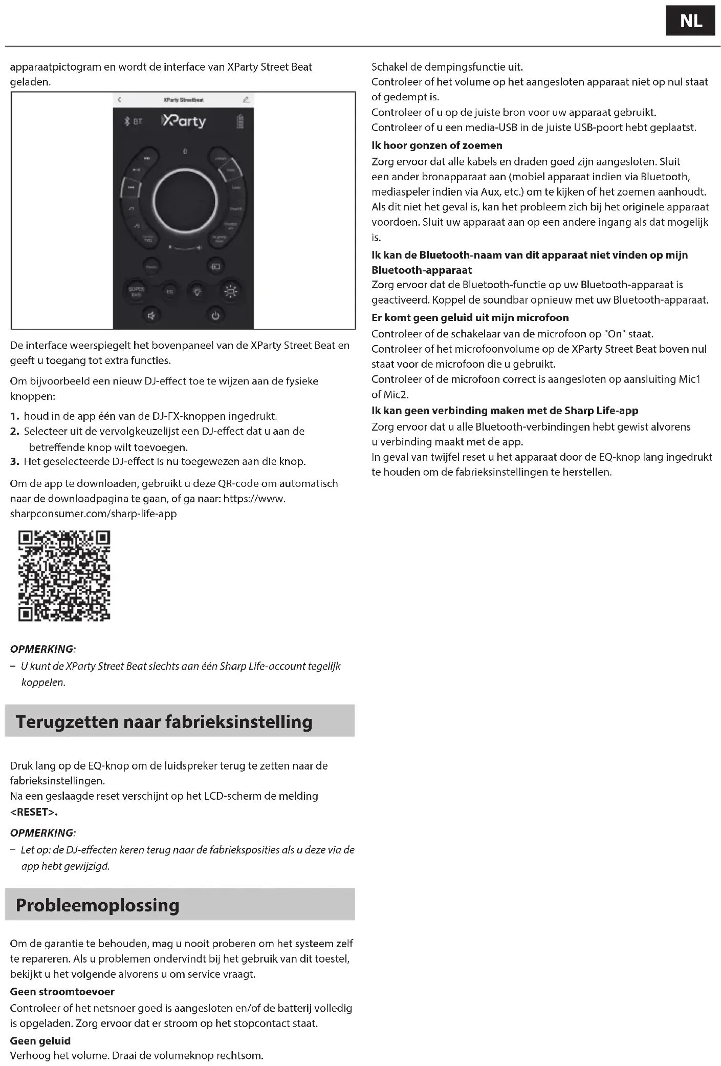 Om de app te downloaden, gebruikt u deze QR-code om automatisch naar de downloadpagina te gaan, of ga naar: https://www. sharpconsumer.com/sharp-life-app OPMERKING: ū U kunt de XParty Street Beat slechts aan één Sharp Life-account tegelijk koppelen. Terugzetten naar fabrieksinstelling Druk lang op de EQ-knop om de luidspreker terug te zetten naar de fabrieksinstellingen. Na een geslaagde reset verschijnt op het LCD-scherm de melding <RESET>. OPMERKING: ū Let op: de DJ-eecten keren terug naar de fabrieksposities als u deze via de app hebt gewijzigd. Probleemoplossing Om de garantie te behouden, mag u nooit proberen om het systeem zelf te repareren. Als u problemen ondervindt bij het gebruik van dit toestel, bekijkt u het volgende alvorens u om service vraagt. Geen stroomtoevoer Controleer of het netsnoer goed is aangesloten en/of de batterij volledig is opgeladen. Zorg ervoor dat er stroom op het stopcontact staat. Geen geluid Verhoog het volume. Draai de volumeknop rechtsom. Schakel de dempingsfunctie uit. Controleer of het volume op het aangesloten apparaat niet op nul staat of gedempt is. Controleer of u op de juiste bron voor uw apparaat gebruikt. Controleer of u een media-USB in de juiste USB-poort hebt geplaatst. Ik hoor gonzen of zoemen Zorg ervoor dat alle kabels en draden goed zijn aangesloten. Sluit een ander bronapparaat aan (mobiel apparaat indien via Bluetooth, mediaspeler indien via Aux, etc.) om te kijken of het zoemen aanhoudt. Als dit niet het geval is, kan het probleem zich bij het originele apparaat voordoen. Sluit uw apparaat aan op een andere ingang als dat mogelijk is. Ik kan de Bluetooth-naam van dit apparaat niet vinden op mijn Bluetooth-apparaat Zorg ervoor dat de Bluetooth-functie op uw Bluetooth-apparaat is geactiveerd. Koppel de soundbar opnieuw met uw Bluetooth-apparaat. Er komt geen geluid uit mijn microfoon Controleer of de schakelaar van de microfoon op "On" staat. Controleer of het microfoonvolume op de XParty Street Beat boven nul staat voor de microfoon die u gebruikt. Controleer of de microfoon correct is aangesloten op aansluiting Mic1 of Mic2. Ik kan geen verbinding maken met de Sharp Life-app Zorg ervoor dat u alle Bluetooth-verbindingen hebt gewist alvorens uverbinding maakt met de app. In geval van twijfel reset u het apparaat door de EQ-knop lang ingedrukt te houden om de fabrieksinstellingen te herstellen.45 Ważne środki ostrożności Należy przestrzegać wszystkich podanych środków ostrożności i ostrzeżeń. Instrukcję należy zachować na przyszłość. Ten symbol informuje użytkownika, aby zapoznał się zinstrukcją obsługi w celu uzyskania dodatkowych informacji dotyczących bezpieczeństwa, obsługi ikonserwacji.Ten symbol wskazuje na obecność w produkcie nieizolowanego „niebezpiecznego napięcia”, które może być na tyle duże, aby stwarzać ryzyko porażenia prądem elektrycznym.Dotyczy prądu przemiennego (AC)Ten symbol informuje, że oznaczone nim napięcie znamionowe to napięcie prądu przemiennego.Dotyczy sprzętu klasy II. Ten symbol wskazuje, że opisywany produkt posiada system podwójnej izolacji i nie wymaga bezpiecznego połączenia z uziemieniem. Ostrzeżenia Uszkodzenia• Po usunięciu opakowania należy sprawdzić, czy urządzenie nie jest uszkodzone. W przypadku jakiegokolwiek uszkodzenia nie korzystaj zurządzenia i skontaktuj się ze sprzedawcą.Podłączenie zasilania i dostępność• Nie wolno dotykać przewodu zasilającego mokrymi rękoma, ponieważ mogłoby to spowodować porażenie prądem. Jeśli wtyczka przewodu zasilającego nie pasuje do twojego gniazdka elektrycznego, nie wciskaj jej na siłę. Przed odłączeniem przewodu zasilającego od gniazdka elektrycznego należy całkowicie wyłączyć zasilanie urządzenia. Jeśli nie używasz urządzenia przez dłuższy czas, odłącz przewód zasilający od gniazdka elektrycznego. Dopilnuj, by wtyczka była zawsze łatwo dostępna. Nie podłączać urządzenia do przedłużaczy.Źródło zasilania• Upewnij się, że urządzenie zostało podłączone do gniazdka elektrycznego 100–240 V~, 50/60 Hz. Używanie wyższego napięcia może powodować awarie, a nawet zapalenie się urządzenia.Nierozbieralna wtyczka przewodu zasilającego z bezpiecznikiem (bez możliwości wymiany) – dotyczy wyłącznie Wielkiej Brytanii Malty, Cypru i Irlandii.• Przewód zasilający w opisywanym urządzeniu wyposażony jest wwtyczkę z bezpiecznikiem 3 A. Wartość bezpiecznika jest podana na obudowie wtyczki; jeśli wymaga wymiany, należy zastosować bezpiecznik zgodny z BS1362 o tych samych parametrach znamionowych.Zabezpieczenie przewodu zasilającego• Uważaj, by nie uszkodzić przewodu zasilającego: nie stawiaj na nim ciężkich przedmiotów, nie rozciągaj go ani nie wyginaj. Uszkodzenie przewodu zasilającego może spowodować pożar lub porażenie prądem. Jeśli przewód zasilający zostanie uszkodzony, należy go wymienić.Bezpieczeństwo dzieci• Zawsze zachowuj podstawowe środki ostrożności podczas korzystania z urządzenia, zwłaszcza w obecności dzieci. Nadzoruj dzieci, by nie bawiły się urządzeniem.Lokalizacja• Podczas użytkowania opisywane urządzenie należy ustawić na płaskiej, stabilnej powierzchni; żadna część urządzenia głównego nie powinna być wysunięta poza krawędź powierzchni, na której urządzenie zostało ustawione. Zagrożenia związane z zablokowaniem otworów wentylacyjnych• Szczeliny i otwory w obudowie służą do wentylacji urządzenia, w celu zapewnienia niezawodnego działania i ochrony przed przegrzaniem; tych otworów nie wolno blokować ani zakrywać. Należy pozostawić 5cm wolnego miejsca wokół urządzenia dla zapewnienia odpowiedniej wentylacji. Nigdy nie pozwalaj nikomu wsuwać czegokolwiek w otwory, gniazda i inne szczeliny w obudowie urządzenia, ponieważ może to spowodować porażenie prądem.Ciepło i temperatura podczas pracy• Nie umieszczaj urządzenia w pobliżu źródeł cie