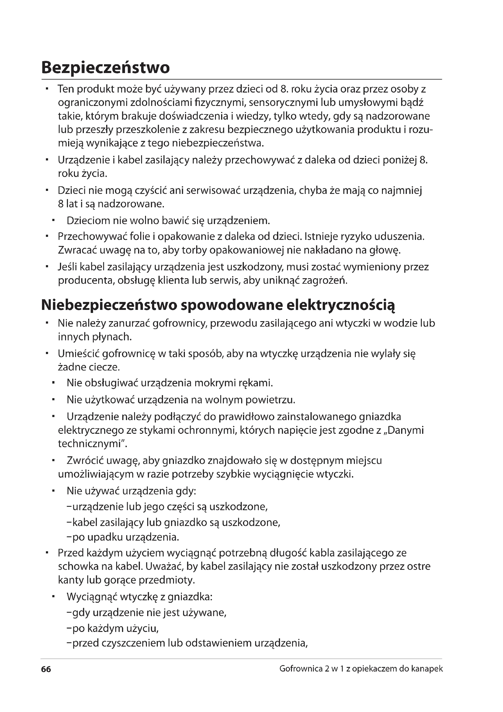 Gofrownica 2 w 1 z opiekaczem do kanapek Bezpieczeństwo Ten produkt może być używany przez dzieci od 8. roku życia oraz przez osoby z ograniczonymi zdolnościami fizycznymi, sensorycznymi lub umysłowymi bądź takie, którym brakuje doświadczenia i wiedzy, tylko wtedy, gdy są nadzorowane lub przeszły przeszkolenie z zakresu bezpiecznego użytkowania produktu i rozu- mieją wynikające z tego niebezpieczeństwa. Urządzenie i kabel zasilający należy przechowywać z daleka od dzieci poniżej 8. roku życia. Dzieci nie mogą czyścić ani serwisować urządzenia, chyba że mają co najmniej 8 lat i są nadzorowane. Dzieciom nie wolno bawić się urządzeniem. Przechowywać folie i opakowanie z daleka od dzieci. Istnieje ryzyko uduszenia. Zwracać uwagę na to, aby torby opakowaniowej nie nakładano na głowę. Jeśli kabel zasilający urządzenia jest uszkodzony, musi zostać wymieniony przez producenta, obsługę klienta lub serwis, aby uniknąć zagrożeń. Niebezpieczeństwo spowodowane elektrycznością Nie należy zanurzać gofrownicy, przewodu zasilającego ani wtyczki w wodzie lub innych płynach. Umieścić gofrownicę w taki sposób, aby na wtyczkę urządzenia nie wylały się żadne ciecze. Nie obsługiwać urządzenia mokrymi rękami. Nie użytkować urządzenia na wolnym powietrzu. Urządzenie należy podłączyć do prawidłowo zainstalowanego gniazdka elektrycznego ze stykami ochronnymi, których napięcie jest zgodne z „Danymi technicznymi”. Zwrócić uwagę, aby gniazdko znajdowało się w dostępnym miejscu umożliwiającym w razie potrzeby szybkie wyciągnięcie wtyczki. Nie używać urządzenia gdy: − urządzenie lub jego części są uszkodzone, − kabel zasilający lub gniazdko są uszkodzone, − po upadku urządzenia. Przed każdym użyciem wyciągnąć potrzebną długość kabla zasilającego ze schowka na kabel. Uważać, by kabel zasilający nie został uszkodzony przez ostre kanty lub gorące przedmioty. Wyciągnąć wtyczkę z gniazdka: − gdy urządzenie nie jest używane, − po każdym użyciu, − przed czyszczeniem lub odstawieniem urządzenia,Bezpieczeństwo