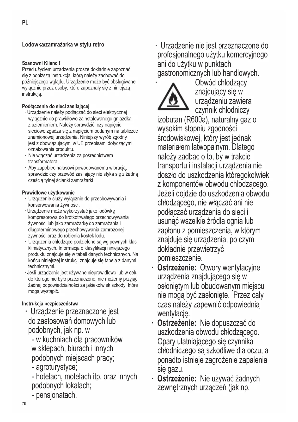 Obwód chłodzący znajdujący się w urządzeniu zawiera czynnik chłodniczy izobutan (R600a), naturalny gaz o wysokim stopniu zgodności środowiskowej, który jest jednak materiałem łatwopalnym. Dlatego należy zadbać o to, by w trakcie transportu i instalacji urządzenia nie doszło do uszkodzenia któregokolwiek z komponentów obwodu chłodzącego. Jeżeli dojdzie do uszkodzenia obwodu chłodzącego, nie włączać ani nie podłączać urządzenia do sieci i usunąć wszelkie źródła ognia lub zapłonu z pomieszczenia, w którym znajduje się urządzenia, po czym dokładnie przewietrzyć pomieszczenie. ∙ Ostrzeżenie: Otwory wentylacyjne urządzenia znajdującego się w osłoniętym lub obudowanym miejscu nie mogą być zasłonięte. Przez cały czas należy zapewnić odpowiednią wentylację. ∙ Ostrzeżenie: Nie dopuszczać do uszkodzenia obwodu chłodzącego. Opary ulatniającego się czynnika chłodniczego są szkodliwe dla oczu, a ponadto istnieje zagrożenie zapalenia się gazu. ∙ Ostrzeżenie: Nie używać żadnych zewnętrznych urządzeń (jak np.79 142 x 208 mm nagrzewnice) w celu przyśpieszenia procesu rozmrażania; stosować wyłącznie metody zalecane w niniejszej instrukcji. ∙ Ostrzeżenie: Nie używać żadnych innych urządzeń elektrycznych (np. maszyny do robienia lodu) wewnątrz zamrażarki, chyba że niniejsza instrukcja wyraźnie mówi inaczej. ∙ Przed podłączeniem urządzenia do sieci należy dokładnie sprawdzić, czy nie zostało ono – w tym także przewód zasilający – uszkodzone podczas transportu. W przypadku stwierdzenia jakiegokolwiek uszkodzenia, nie wolno podłączać urządzenia do zasilania. ∙ Przy ustawianiu urządzenia powinno upewnić się, że przewody elektryczne nie są zaplątane lub uszkodzone. ∙ Nie należy ustawiać przenośnych gniazdek elektrycznych lub źródeł zasilania w pobliżu tylnej strony urządzenia. ∙ Urządzenie nie jest przeznaczone do przechowywania substancji wybuchowych, jak np. pojemniki z palnym aerozolem. ∙ Przy sprzedaży, przekazywaniu lub oddawaniu do recyklingu należy wskazać na cyklopentanu (C