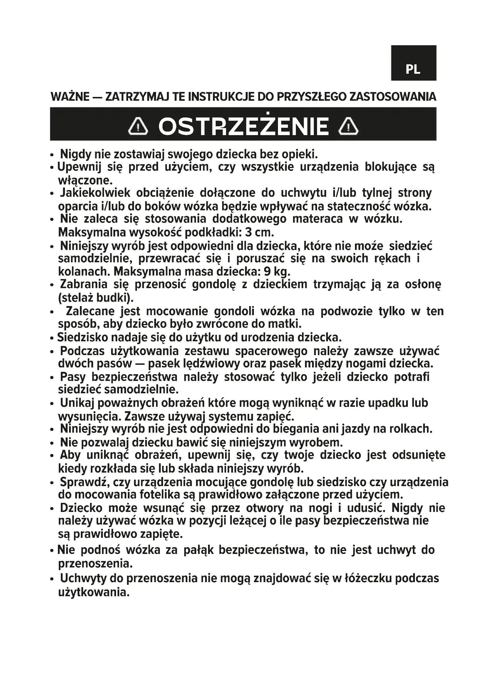 - Uchwyty do przenoszenia nie mogą znajdować się w łóżeczku podczas użytkowania. PLPL15 UWAGA PRZED UŻYCIEM WÓZKA NALEŻY UWAŻNIE ZAPOZNAĆ SIĘ Z INSTRUKCJĄ UŻYTKOWANIA.