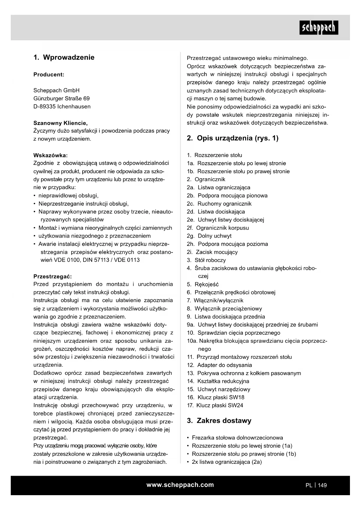 Producent: Scheppach GmbH Günzburger Straße 69 D-89335 Ichenhausen Szanowny Kliencie, Życzymy dużo satysfakcji i powodzenia podczas pracy z nowym urządzeniem. Wskazówka: Zgodnie z obowiązującą ustawą o odpowiedzialności cywilnej za produkt, producent nie odpowiada za szko- dy powstałe przy tym urządzeniu lub przez to urządze- nie w przypadku: