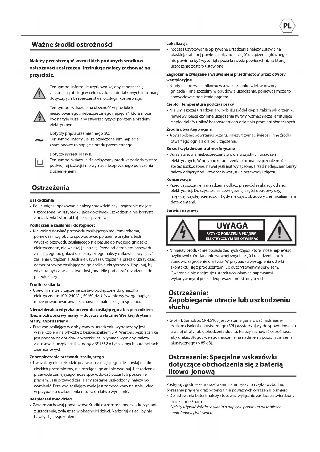 A. Met een volledig opgeladen batterijset kunt u tot 10 uur afspelen op 50% volume. Als de batterijset leeg is, laad deze dan minimaal gedurende vier uur op. Q. Kan ik de SumoBox buitenshuis gebruiken? A. Als u de de beschermhoeken hebt gemonteerd, dan is de SumoBox geschikt voor gebruik buitenshuis. De SumoBox heeft geen IPX-classicatie, dus bij regen of overmatig vuil/stof/zand adviseren wij u de luidspreker binnen te zetten. De SumoBox Pro (CP-LS200) heeft beschermingsklasse IPX4 (spatwaterdicht) en is beter geschikt voor gebruik buitenshuis.PL Ważne środki ostrożności Należy przestrzegać wszystkich podanych środków ostrożności i ostrzeżeń. Instrukcję należy zachować na przyszłość. Ten symbol informuje użytkownika, aby zapoznał się zinstrukcją obsługi w celu uzyskania dodatkowych informacji dotyczących bezpieczeństwa, obsługi i konserwacji.Ten symbol wskazuje na obecność w produkcie nieizolowanego „niebezpiecznego napięcia”, które może być na tyle duże, aby stwarzać ryzyko porażenia prądem elektrycznym.Dotyczy prądu przemiennego (AC)Ten symbol informuje, że oznaczone nim napięcie znamionowe to napięcie prądu przemiennego.Dotyczy sprzętu klasy II. Ten symbol wskazuje, że opisywany produkt posiada system podwójnej izolacji i nie wymaga bezpiecznego połączenia zuziemieniem. Ostrzeżenia Uszkodzenia• Po usunięciu opakowania należy sprawdzić, czy urządzenie nie jest uszkodzone. W przypadku jakiegokolwiek uszkodzenia nie korzystaj zurządzenia i skontaktuj się ze sprzedawcą.Podłączenie zasilania i dostępność• Nie wolno dotykać przewodu zasilającego mokrymi rękoma, ponieważ mogłoby to spowodować porażenie prądem. Jeśli wtyczka przewodu zasilającego nie pasuje do twojego gniazdka elektrycznego, nie wciskaj jej na siłę. Przed odłączeniem przewodu zasilającego od gniazdka elektrycznego należy całkowicie wyłączyć zasilanie urządzenia. Jeśli nie używasz urządzenia przez dłuższy czas, odłącz przewód zasilający od gniazdka elektrycznego. Dopilnuj, by wtyczka była zawsze łatwo dostępna. Nie podłączać urządzenia do przedłużaczy.Źródło zasilania• Upewnij się, że urządzenie zostało podłączone do gniazdka elektrycznego 100–240 V~, 50/60 Hz. Używanie wyższego napięcia może powodować awarie, a nawet zapalenie się urządzenia.Nierozbieralna wtyczka przewodu zasilającego z bezpiecznikiem (bez możliwości wymiany) – dotyczy wyłącznie Wielkiej Brytanii Malty, Cypru i Irlandii.• Przewód zasilający w opisywanym urządzeniu wyposażony jest wnierozbieralną wtyczkę z bezpiecznikiem 3 A. Wartość bezpiecznika jest podana na obudowie wtyczki; jeśli wymaga wymiany, należy zastosować bezpiecznik zgodny z BS1362 o tych samych parametrach znamionowych.Zabezpieczenie przewodu zasilającego• Uważaj, by nie uszkodzić przewodu zasilającego: nie stawiaj na nim ciężkich przedmiotów, nie rozciągaj go ani nie wyginaj. Uszkodzenie przewodu zasilającego może spowodować pożar lub porażenie prądem. Jeśli przewód zasilający zostanie uszkodzony, należy go wymienić. Przewód zasilający mnie jest zamocowany na stałe, więc wprzypadku uszkodzenia można go łatwo wymienić.Bezpieczeństwo dzieci• Zawsze zachowuj podstawowe środki ostrożności podczas korzystania z urządzenia, zwłaszcza w obecności dzieci. Nadzoruj dzieci, by nie bawiły się urządzeniem.Lokalizacja• Podczas użytkowania opisywane urządzenie należy ustawić na płaskiej, stabilnej powierzchni; żadna część urządzenia głównego nie powinna być wysunięta poza krawędź powierzchni, na której urządzenie zostało ustawione. Zagrożenia związane z wsuwaniem przedmiotów przez otwory wentylacyjne• Nigdy nie pozwalaj nikomu wsuwać czegokolwiek w otwory, gniazda i inne szczeliny w obudowie urządzenia, ponieważ może to spowodować porażenie prądem.Ciepło i temperatura podczas pracy• Nie umieszczaj urządzenia w pobliżu źródeł ciepła, takich jak grzejniki, nawiewy, piece czy inne urządzenia (w tym wzmacniacze) emitujące ciepło. Należy unikać bezpośredniego działania promieni słonecznych.Źródła otwartego ognia• Aby zapobiec powstaniu pożaru, należy trzymać świece i inne źródła otwartego ognia z dla od urządzenia.Burze i wyładowania atmosferyczne• Burze stanowią niebezpieczeństwo dla wszystkich urządzeń elektrycznych. W przypadku uderzenia pioruna urządzenie może zostać uszkodzone, nawet jeśli jest wyłączone. Przed nadejściem burzy należy odłączyć od urządzenia wszystkie przewody i złącza.Konserwacja• Przed czyszczeniem urządzenia odłącz przewód zasilający od sieci elektrycznej. Do czyszczenia zewnętrznej części obudowy użyj miękkiej, czystej ściereczki. Nigdy nie czyść obudowy chemikaliami ani detergentami.Serwis i naprawy UWAGA RYZYKO PORAŻENIA PRĄDEMELEKTRYCZNYM NIE OTWIERAĆ• Niniejszy produkt nie posiada żadnych części, które może naprawiać użytkownik. Odsłanianie wewnętrznych części urządzenia może stanowić zagrożenie dla życia. W przypadku wystąpienia usterki skontaktuj się z producentem lub autoryzowanym serwisem. Gwarancja nie obejmuje usterek wywołanych naprawami wykonywanymi przez nieupoważnione strony trzecie. Ostrzeżenie: Zapobieganie utracie lub uszkodzeniu słuchu
